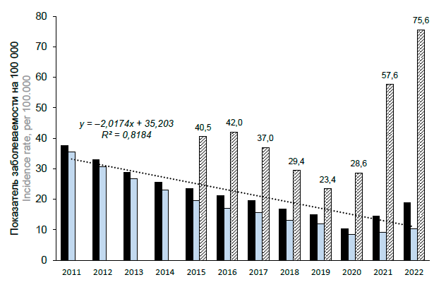 Рис. 1. Заболеваемость сифилисом в России в 2011–2022 гг.