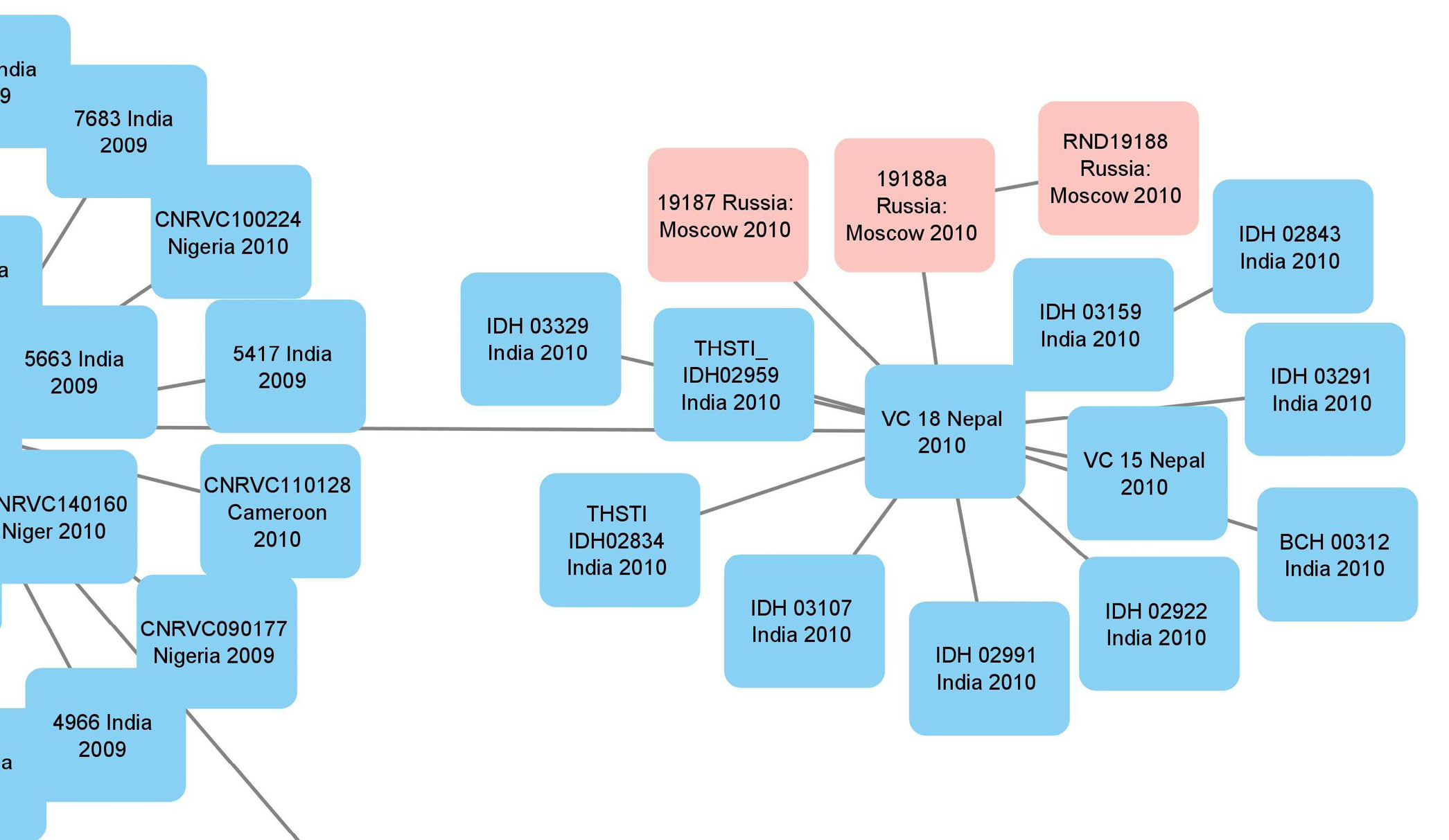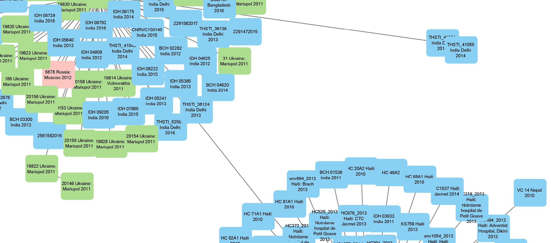 Одной из задач исследователей в нашей стране является импортозамещение, что предусматривает преодоление зависимости от импортных поставок программных средств и использование преимущественно отечественного программного обеспечения1. Это подчёркивает актуальность разработки отечественных программных продуктов. Не менее актуальными проблемами являются анализ и визуализация получаемых результатов. Одним из наиболее часто используемых методов анализа является построение дендрограммы, отражающей филогенетические связи между различными штаммами V. cholerae. Однако, чем больше штаммов взято в исследование, тем более громоздкой получается итоговая дендрограмма, что осложняет проведение её анализа. Вместе с тем одним из универсальных инструментов анализа являются геоинформационные системы (ГИС), позволяющие комбинировать пространственные, временны́е и эпидемиологические данные. В настоящее время широкое распространение получили онлайн-ГИС и интерактивные базы данных, размещаемые в сети Интернет, что обеспечивает возможность работы с ними широкому кругу исследователей [18–21].