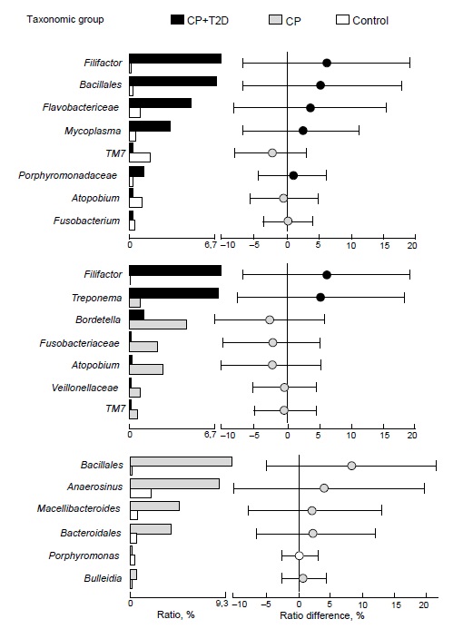 The comparative analysis of the taxonomic profile of microbiome of patients with CP, with or without association with T2D, showed more frequent occurrence in the first group of bacteria of the Filifactor and Treponema genera and lower frequency of occurrence in the microbiome of 5 taxonomic groups: Bordetella and Atopobium genera, Fusobacteriaceae and Veillonellaceae families, TM7.