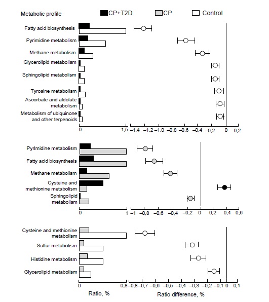 When comparing the groups of CP with and without T2D, differences in the representation of 5 metabolic pathways were revealed: in the group of CP+T2D, an increase in cysteine and methionine metabolism and a decrease in pyrimidine metabolism, fatty acid biosynthesis, methane metabolism, and sphingolipid metabolism were observed.