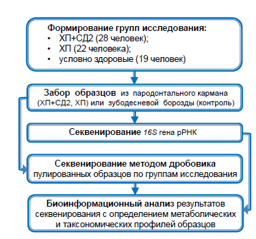 Due to the necessity of using pooled samples of biological material for metagenomic studies, the maximum homogeneity of the study groups was a requirement; therefore, patients with mild and severe course of pathological processes were excluded from the study, in other words, all patients under study had a moderately severe course of the diseases. Patients did not receive treatment for CP during the last 6 months. Among patients with T2D, 11 patients received insulin therapy, 13 patients — oral sugar-lowering drugs, 4 patients — combined therapy, which was taken into account when distributing the samples for further pooling.