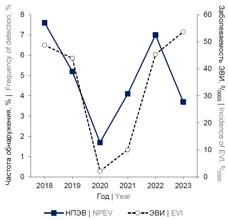 Fig. 1. Dynamics of the frequency of detection of NPEV (%) and incidence of EVI (per 100 thousand children under the age of 17 years) in the Nizhny Novgorod region in the period 2018–2023.