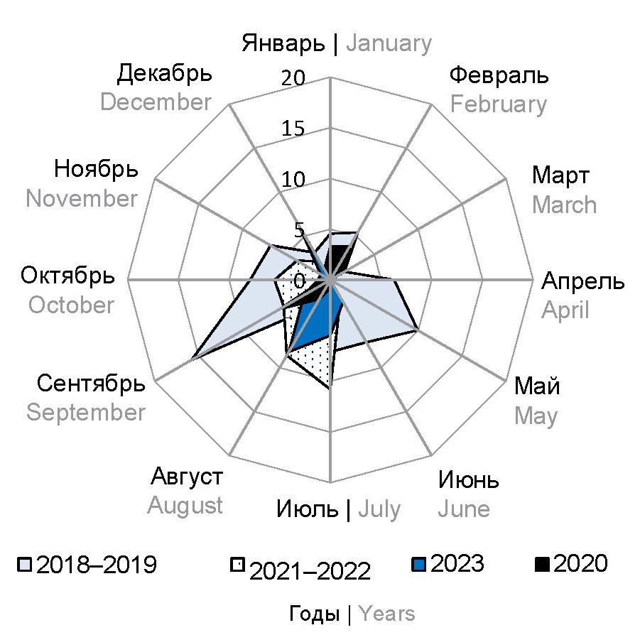 Проведён анализ помесячной частоты обнаружения ЭВ в разных возрастных группах детей с ОКИ в 2018–2022 гг. Установлено, что в 2018 и 2019 гг. динамика изменений частоты обнаружения ЭВ была однотипной. Аналогичная картина наблюдалась при сравнении сезонов 2021 и 2022 гг., что позволило выделить для сравнения объединённые сезоны 2018–2019 гг. (до пандемии) и 2021–2022 гг. (пандемия, отмена «локдауна»). Анализ показал, что до пандемии у детей с кишечной инфекцией ЭВ выявлялись круглогодично, начиная с апреля и заканчивая январем–февралем следующего года. Максимальные значения фиксировались в мае (10,0%; 22/221) и сентябре (15,8%; 38/241). В 2020 г. пик обнаружения ЭВ пришёлся на сентябрь (5,7%; 7/123). В период пандемии 2021–2022 гг., после поэтапного снятия ограничительных мероприятий, ЭВ у детей с ОКИ выявлялись с июня по декабрь, с максимальной частотой обнаружения в июле (10,8%; 34/315). В сезон 2023 г. ЭВ чаще выявлялись в августе (8,2%; 6/73) (рис. 2).