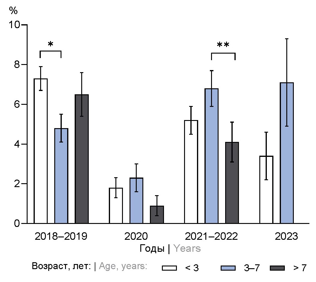 НПЭВ-инфекции подвержены дети всех возрастов. В то же время частота обнаружения ЭВ у пациентов с ОКИ отличалась в разных возрастных группах в изучаемом периоде (рис. 3). Так, до пандемии COVID-19 ЭВ достоверно чаще, чем у детей от 3 до 7 лет, обнаруживался в возрастной группе до 3 лет (7,3 ± 0,6%; 120/1644; р = 0,006739), тогда как в 2021–2022 гг. наиболее часто ЭВ выявлялись у детей в возрасте 3–7 лет (6,8 ± 0,9%; 53/778; р = 0,044991) по сравнению с детьми старше 7 лет. В 2020 и 2023 гг. на фоне низкой частоты обнаружения ЭВ у детей с ОКИ достоверных различий в групповых показателях не установлено, при этом в сезон 2023 г. ЭВ у детей старше 7 лет выявлены не были, несмотря на то что число обследованных детей в возрасте 7–17 лет в 2022 и 2023 гг. отличалось мало (169 и 118 человек соответственно).