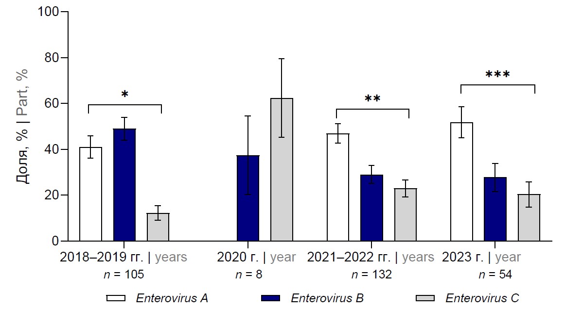 Fig. 5. Species distribution of NPEV isolated from children with AII in 2018–2023. *р = 0.000001; **р ≤ 0.002142; ***р ≤ 0.009897.