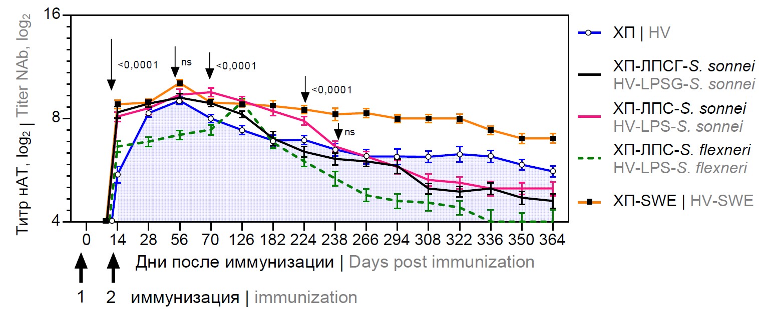 Менее выраженный иммунный ответ ХП-ЛПС-S. flexneri в концентрации 50 мкг/дозу выражался в более отдалённом формировании пика нАТ (к 126-му дню) в сравнении с ХП (на 56-й день). Для ХП-ЛПС-S. flexneri первичный ответ выражался в более значительном повышении уровня нАТ в сыворотке крови морских свинок по сравнению с нативным ХП после первой иммунизации. Бустерное введение препарата приводило к повышению уровня нАТ с формированием повторного пика на 266-й день.