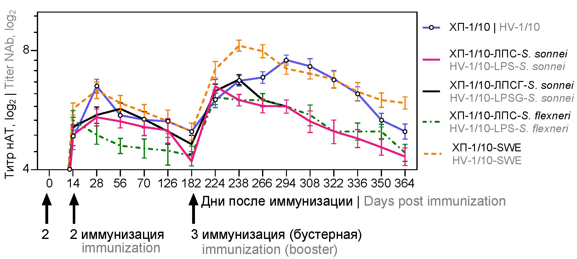 Бустерная иммунизация этими же препаратами через 182 дня приводила к пиковым значениям нАТ в сыворотках крови морских свинок: на 224-й день для ХП-1/10-ЛПС-S. sonnei (6,50 ± 0,26 log2) и ХП-1/10-ЛПС-S. flexneri (6,1 ± 0,3log2), на 238-й — ХП-1/10-ЛПСГ-S. sonnei (6,76 ± 0,2log2), на 294-й — ХП-1/10 (7,57 ± 0,20log2) и ХП-1/10-SWE (8,23 ± 0,26log2) (рис. 4). После максимальных значений титра нАТ наблюдали их плавное снижение к 364-му дню (выше порога отсечения).