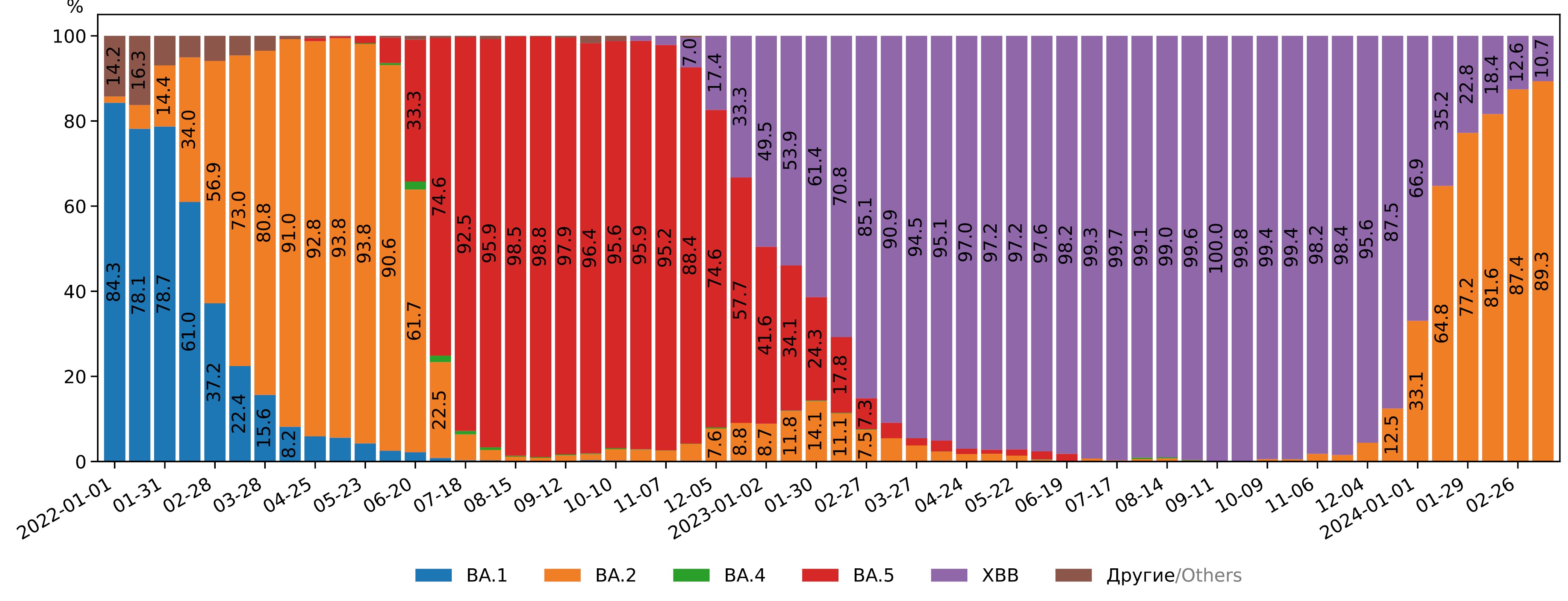 Despite a period of low numbers of COVID-19 cases in the spring of 2022, the emergence of Omicron subvariants BA.4 and BA.5 caused an increase in incidence that lasted until the end of October (Figure 3). In late 2022 and early 2023, highly contagious variants such as BQ.1* emerged. Such shifts in dominant lineages well illustrate the ever-changing and complex nature of SARS-CoV-2 evolution. Notably, in early 2023, modified versions of pre-existing lineages returned to the virus population, notably Omicron BA.2, presented as recombinant forms of XBB*. In November 2023, a variant of coronavirus BA.2.86, unofficially named Pirola, began to spread rapidly in several countries, including Russia. It was notable for the large number of accumulated changes in the genome compared to earlier lineages and by the end of 2023 had become the predominant virus lineage, and in early 2024 its JN.1 sublineage was almost completely dominant in most countries of the world.