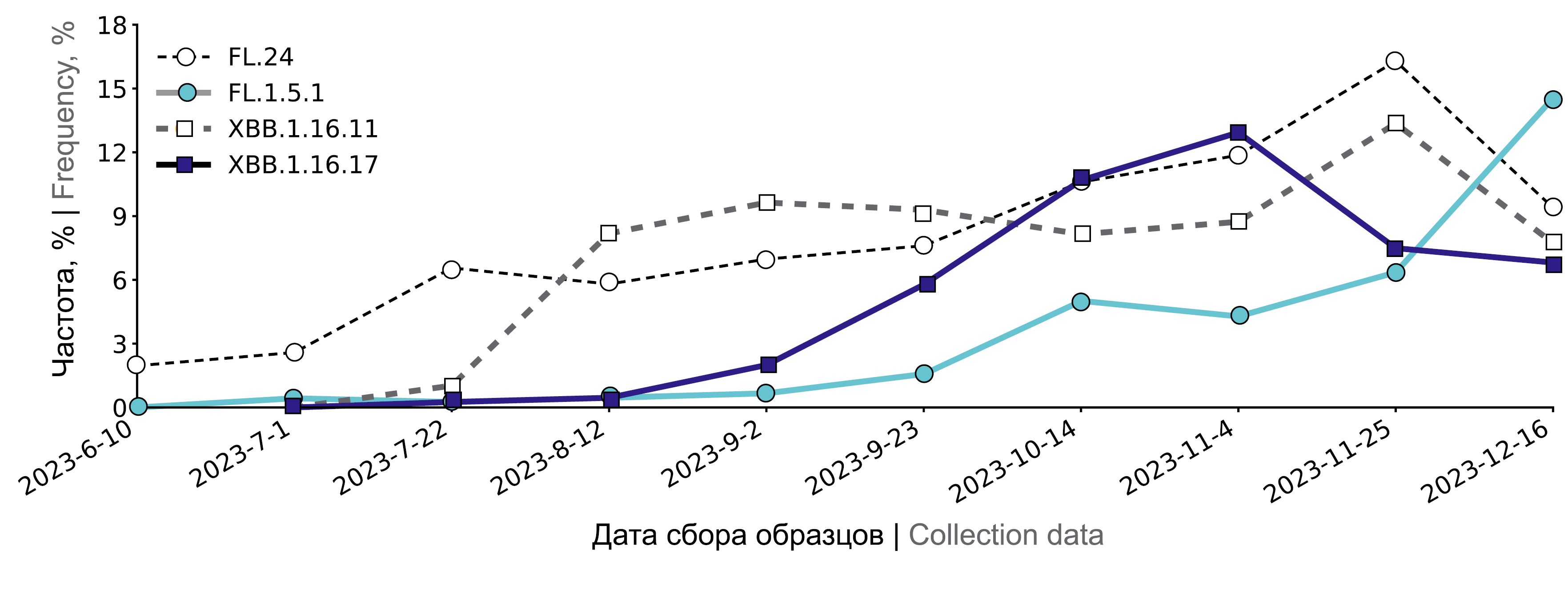Studying the spreading dynamics of these lineages with time can potentially help predict the evolution of SARS-CoV-2. For this reason, the frequency dynamics for several of the discussed sublineages from June through December 2023 are presented in Figure 6. Lineages XBB.1.9.1 and XBB.1.16 were intentionally excluded from this analysis due to the decreasing or static nature of their frequency trend during the period under consideration. The former line significantly decreased its prevalence to almost zero, while the latter line did not change its frequency, remaining between 6–16%. Consequently, they are not considered potentially future dominant lineages.