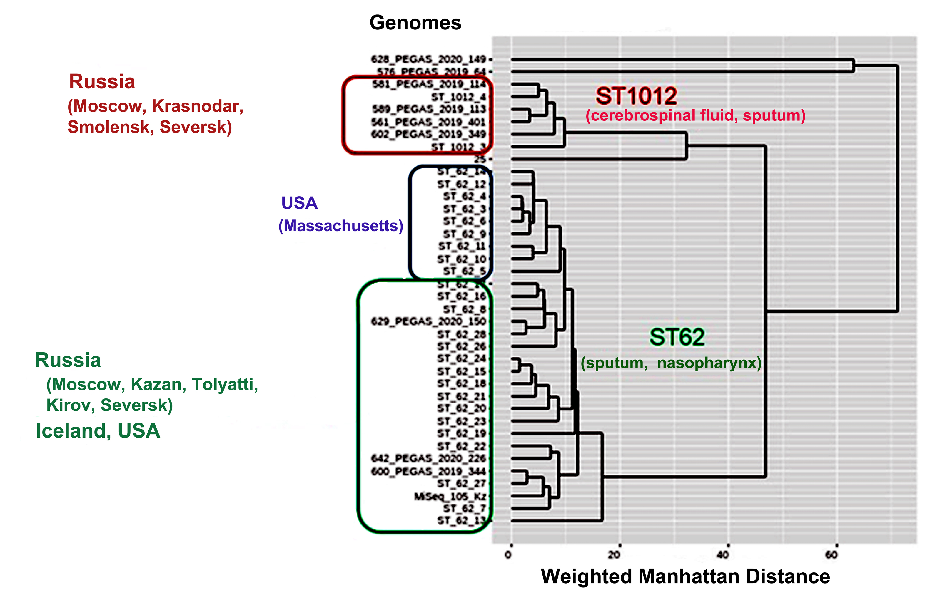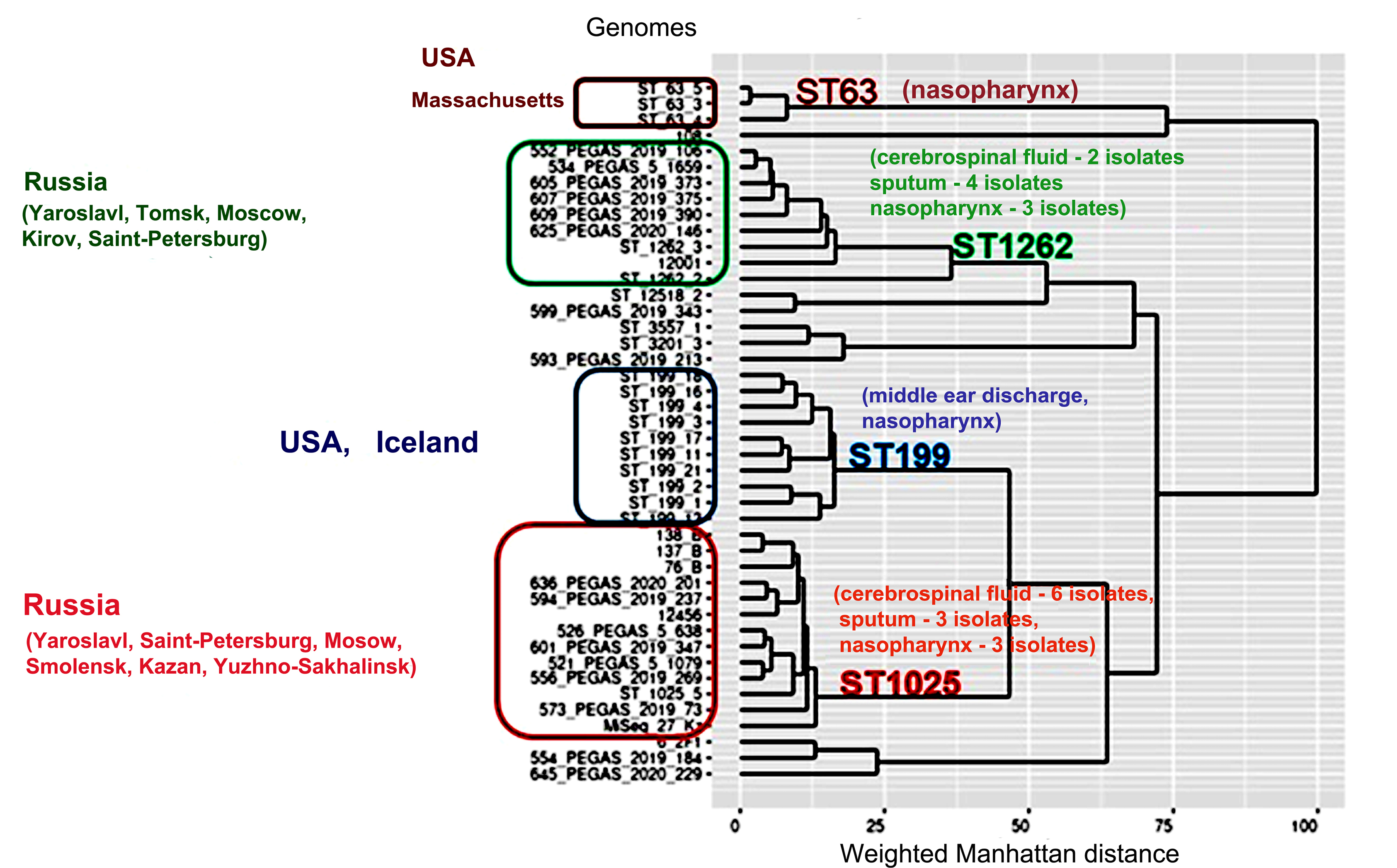 Serogroup 11 dataset included genomes of 38 isolates: 15 from Russia and 23 from other regions of the world. The analysis included whole genome data from isolates obtained from various clinical samples: patients with meningitis (n = 3; source of isolation — liquor), pneumonia (n = 8; source of isolation — sputum), acute otitis media (n = 3; source of isolation — middle ear fluid), carriers (n = 20; source of isolation — nasopharynx), in 1 case there was no information about the diagnosis (source of isolation – blood). For 3 isolates there was no information about the diagnosis and source of isolation.