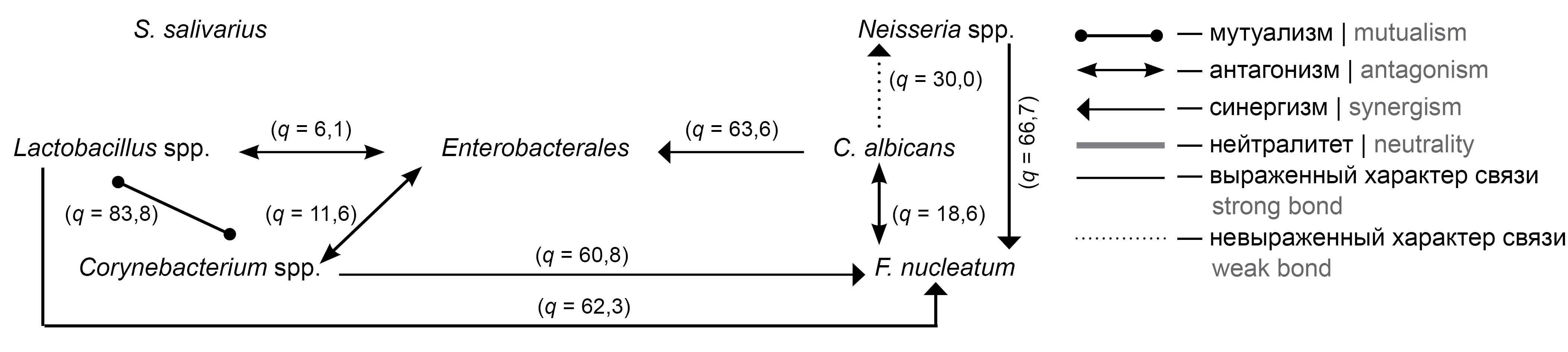 Synergism between Enterobacterales, fungi of the Candida genus and Neisseria spp. (q = 30–70) in group 2 patients persists and leads to the displacement of S salivarius. Furthermore, F. nucleatum forms more divergent relationships than strains of the same species isolated from group 1 patients. Thus, if in group 1 patients the neutrality between Fusobacterium spp. and Neisseria spp. was revealed, in group 2 patients these species show synergism (q = 66.7). The nature of relationships in the pair of Fusobacterium spp. and C. albicans changes in the case of inflammatory changes in the mucosa to antagonistic (q = 18.6), which, at first glance, does not seem logical, but is quite explainable by the fact that in antagonistic relationships between bacteria the spectrum of their metabolite changes, which is reflected in the clinical picture. Antagonistic relations between bacteria of the Enterobacterales order and the Lactobacillus genus are preserved in patients with and without clinical markers of inflammatory process.