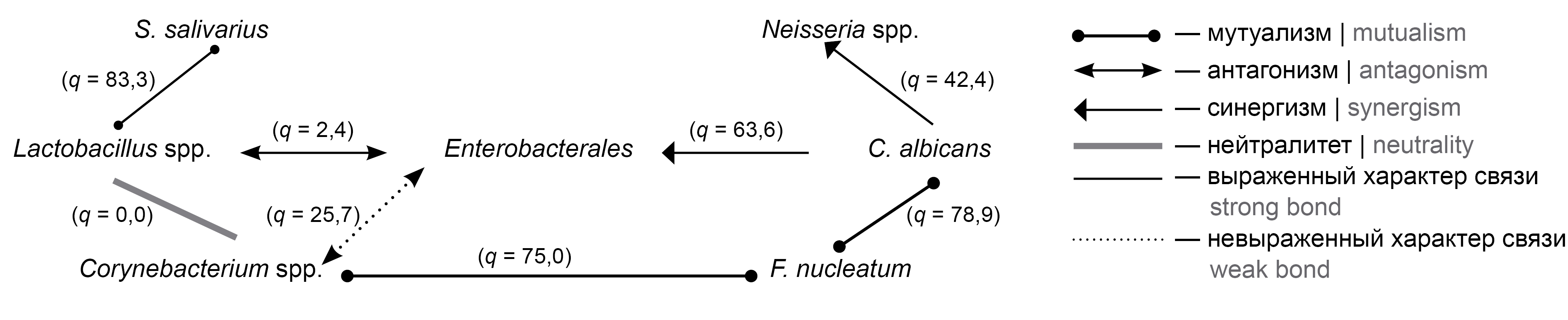 Синергизм между представителями порядка Enterobacterales, грибами рода Candida и Neisseria spp. (q = 30–70) у пациентов 2-й группы сохраняется и приводит к вытеснению S. salivarius. Кроме того, F. nucleatum формирует более разнонаправленные связи, чем штаммы этого же вида, выделенные от пациентов 1-й группы. Так, если у пациентов 1-й группы между Fusobacterium spp. и Neisseria spp. выявлен нейтрализм, то у пациентов 2-й группы эти виды проявляют синергизм (q = 66,7). Характер взаимоотношений в паре Fusobacterium spp. и C. albicans меняется в случае воспалительных изменений СО на антагонистические (q = 18,6), что, на первый взгляд, кажется не логичным, но вполне объяснимо тем, что при антагонистических отношениях между бактериями меняется спектр их метаболитов, что отражается на клинической картине. Антагонистические отношения между бактериями порядка Enterobacterales и рода Lactobacillus сохраняются у пациентов как с клиническими маркерами воспалительного процесса, так и без них.