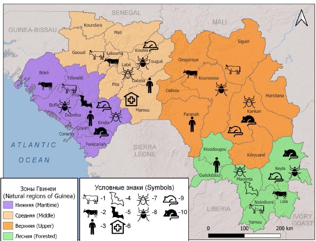 Materials and methods. The study was carried out in the laboratory of the Russian-Guinean Center for Epidemiology and Prevention of Infectious Diseases (Kindia, Republic of Guinea). The study involved 332 sera of febrile patients and 3156 sera from practically healthy volunteers, 1074 blood samples of livestock, 1648 suspensions of ticks, 319 specimens of small mammals and 298 of bats. The study was carried out using ELISA and PCR methods, selected samples were subjected to in-depth genetic analysis.