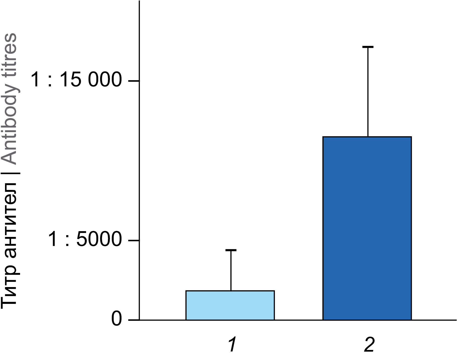 Two intraperitoneal immunizations of 10 laboratory mice with an interval of 2 weeks and subsequent obtaining of blood serum 3 weeks after the second immunization at a dose of 10 µg (0.5 ml) resulted in the formation of antibodies against NV VP1 in the blood of animals. Antibodies in the blood of animals were detected in titers from 1 : 1024 to 1 : 4096, the average titer was 1 : 1536. Immunization of animals with the same dose of protein according to the same scheme, but mixed with 100 mg of aluminum hydroxide caused the appearance of antibodies against NV VP1 in titers up to 1 : 32,768. On average, the antibodies titer was 1 : 13,720, which was almost an order of magnitude higher than the antibodies titers in animals immunized without aluminum hydroxide (Fig. 3). Thus, it was shown that the obtained recombinant protein is able to induce a pronounced antisense response, which significantly increases in the presence of the used adjuvant.