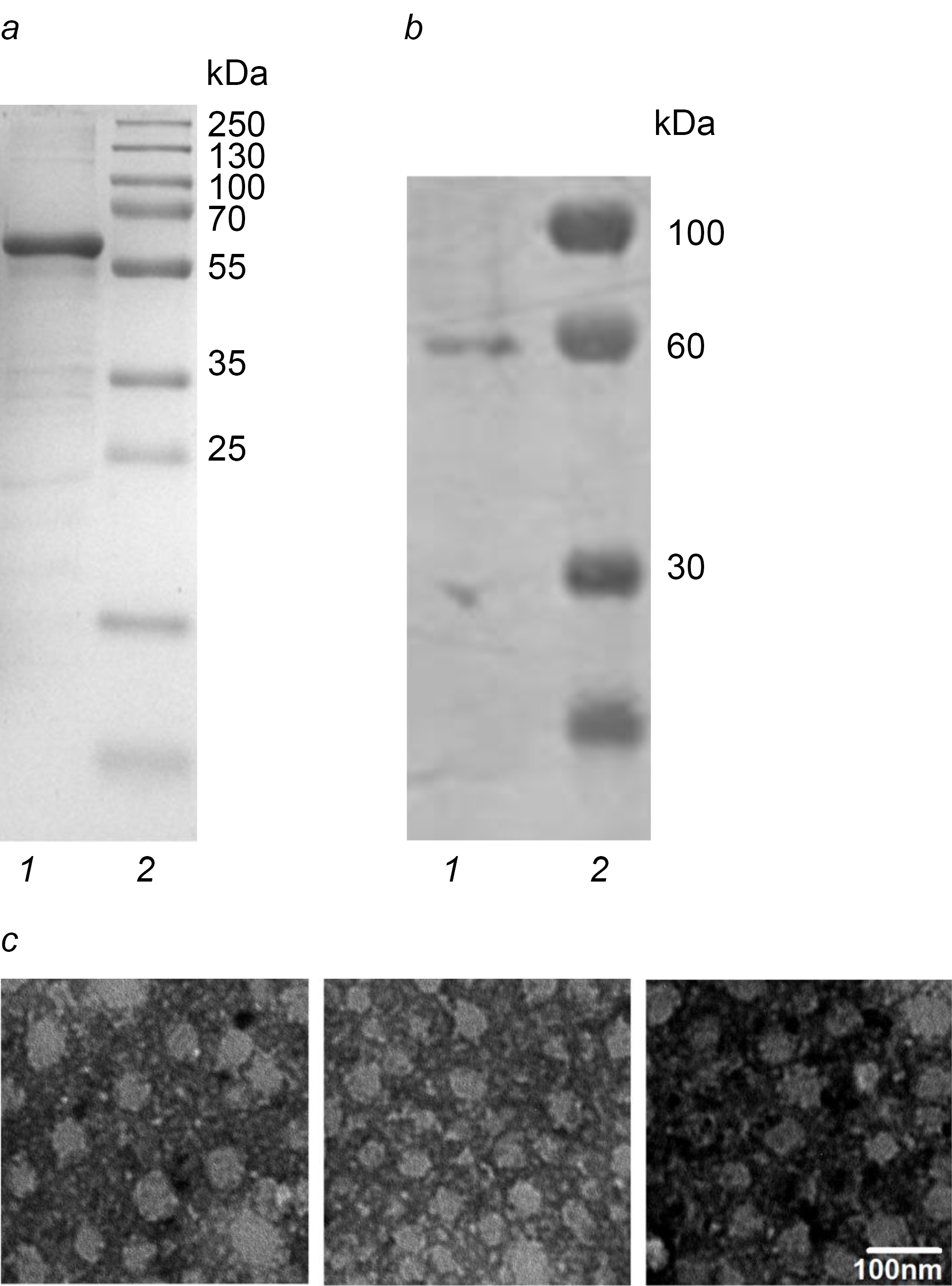 a — electrophoregram of purified norovirus VP1 protein; b — Western-blot of purified norovirus VP1 protein; 1 — VP1; 2 — molecular weight marker; с — electron microscopic photographs of virus-like particles formed by recombinant norovirus VP1. Contrast with 3% uranyl acetate, pH 4.6.