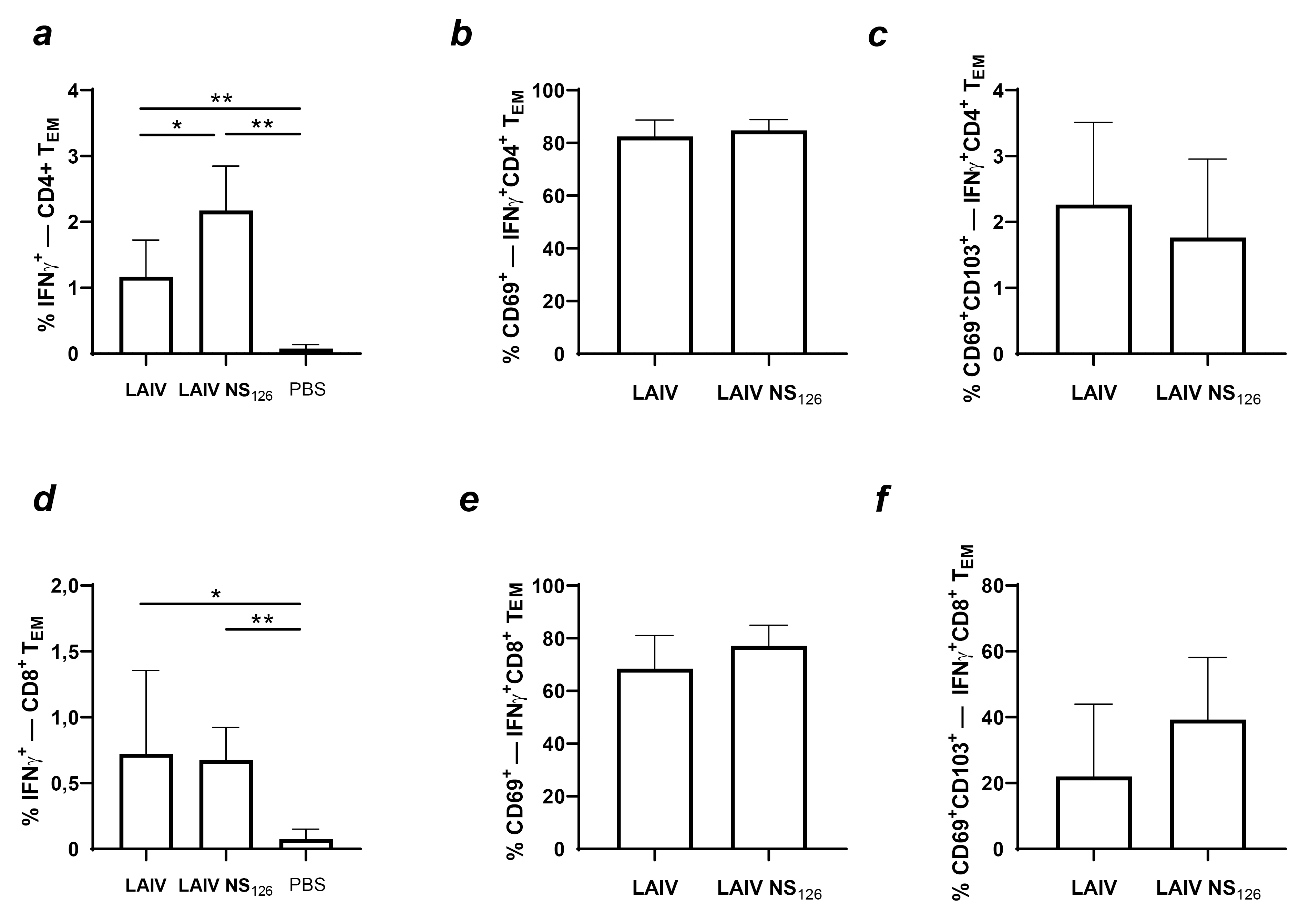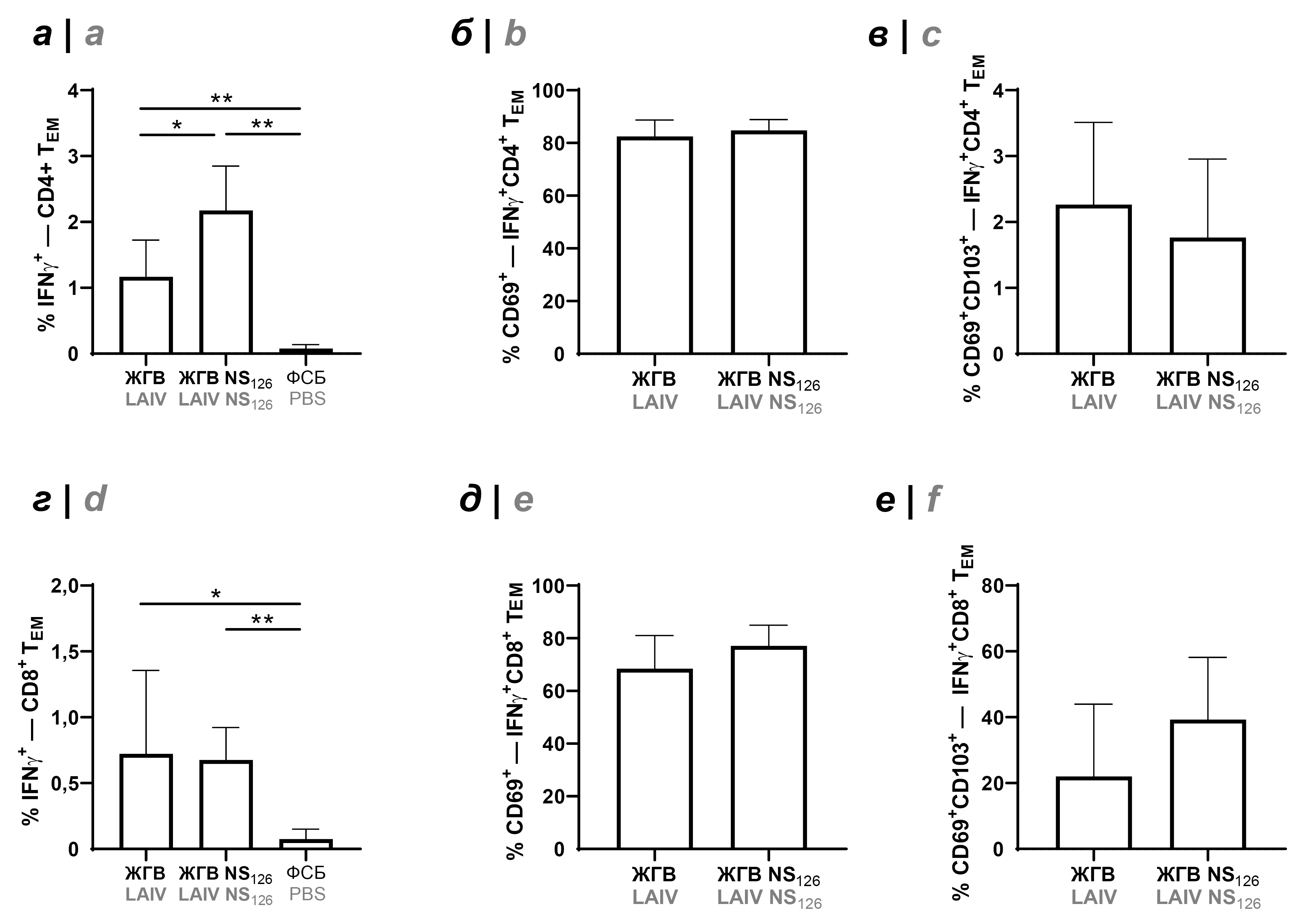 (a, d) Number of IFNγ-producing effector memory T cells (CD44+CD62L–) with CD4+ (a) and CD8+ (d) cell phenotype in groups of mice immunized with LAIV or LAIV with truncated NS126, as well as in controls. Proportion of virus-specific tissue-resident memory cells with CD69+CD103– phenotype among IFNγ+ cells in CD4+ and CD8+ T cell populations (b and f, respectively). Proportion of virus-specific tissue-resident memory cells with CD69+CD103+ phenotype among IFNγ+ cells in CD4+ and CD8+ T cell populations (c and f, respectively).
