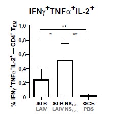 Two-dose immunization of mice with LAIV and LAIV with truncated NS126 stimulated the induction of high levels of virus-specific TEM cells with CD44+CD62L- phenotype in the spleens of mice, and truncation of NS1 protein in the vaccine strain of LAIV significantly increased the levels of polyfunctional CD4+-TEM cells secreting two (IFN-γ, TNF-α) or three (IFN-γ, TNF-α and IL-2) cytokines simultaneously (Fig. 1, а). Furthermore, only the group of mice that received LAIV NS126 showed significantly higher levels of IFN-γ-producing cytotoxic memory T cells compared to controls (Fig. 1, b). Thus, the data obtained indicate that the modified strain of LAIV NS126 may have a higher potential for protection against influenza infection than the classical LAIV variant.