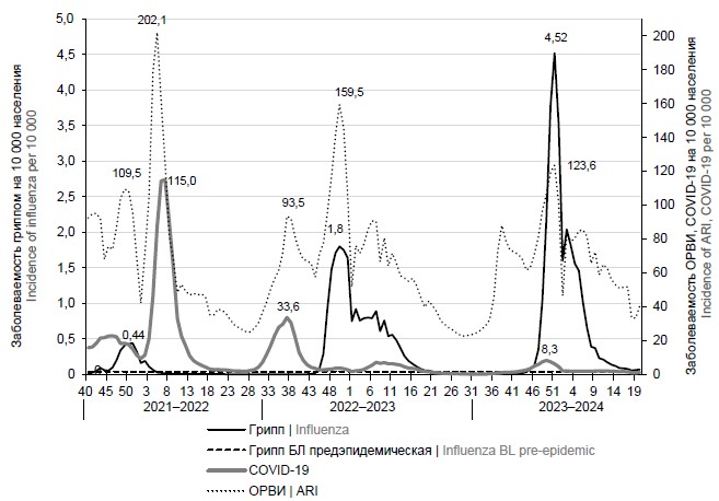 The peculiarity of the 2023–2024 influenza epidemic was an early onset (in week 45 of 2023), as in other influenza epidemics against the background of COVID-19 circulation (in 2021 — in week 45, in 2022 — in week 47). Early onset of influenza epidemics during COVID-19 circulation was also noted in Belarus; the influenza epidemic season of 2021–2022 and 2023–2024 started from week 47, and in Tashkent, the influenza epidemic season of 2023–2024 started from week 44 [7-9].