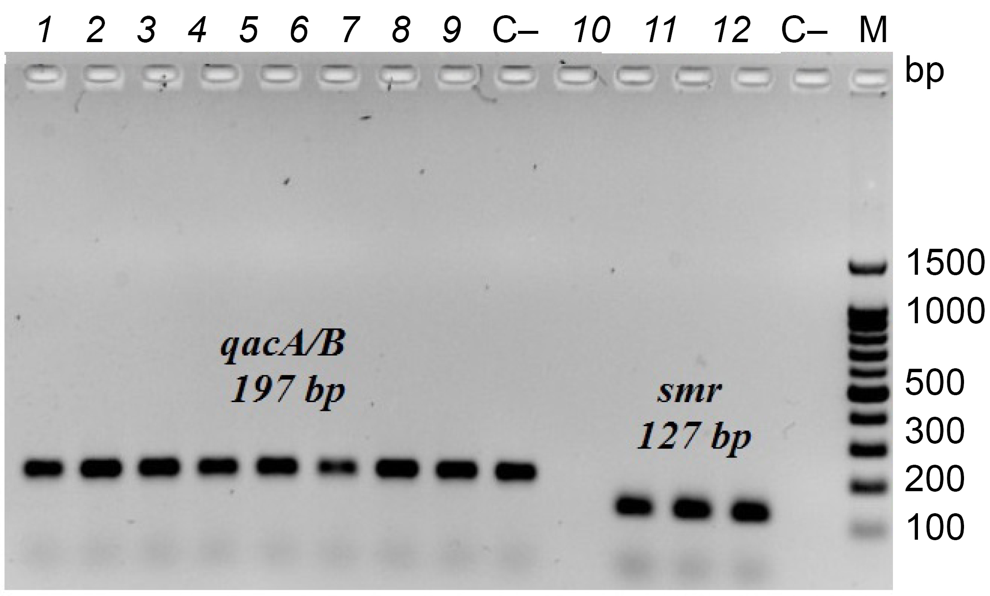 1–9 — qacA/B-positive isolates; 10–12 — smr-positive isolates. С– — negative control. M — DNA length marker.