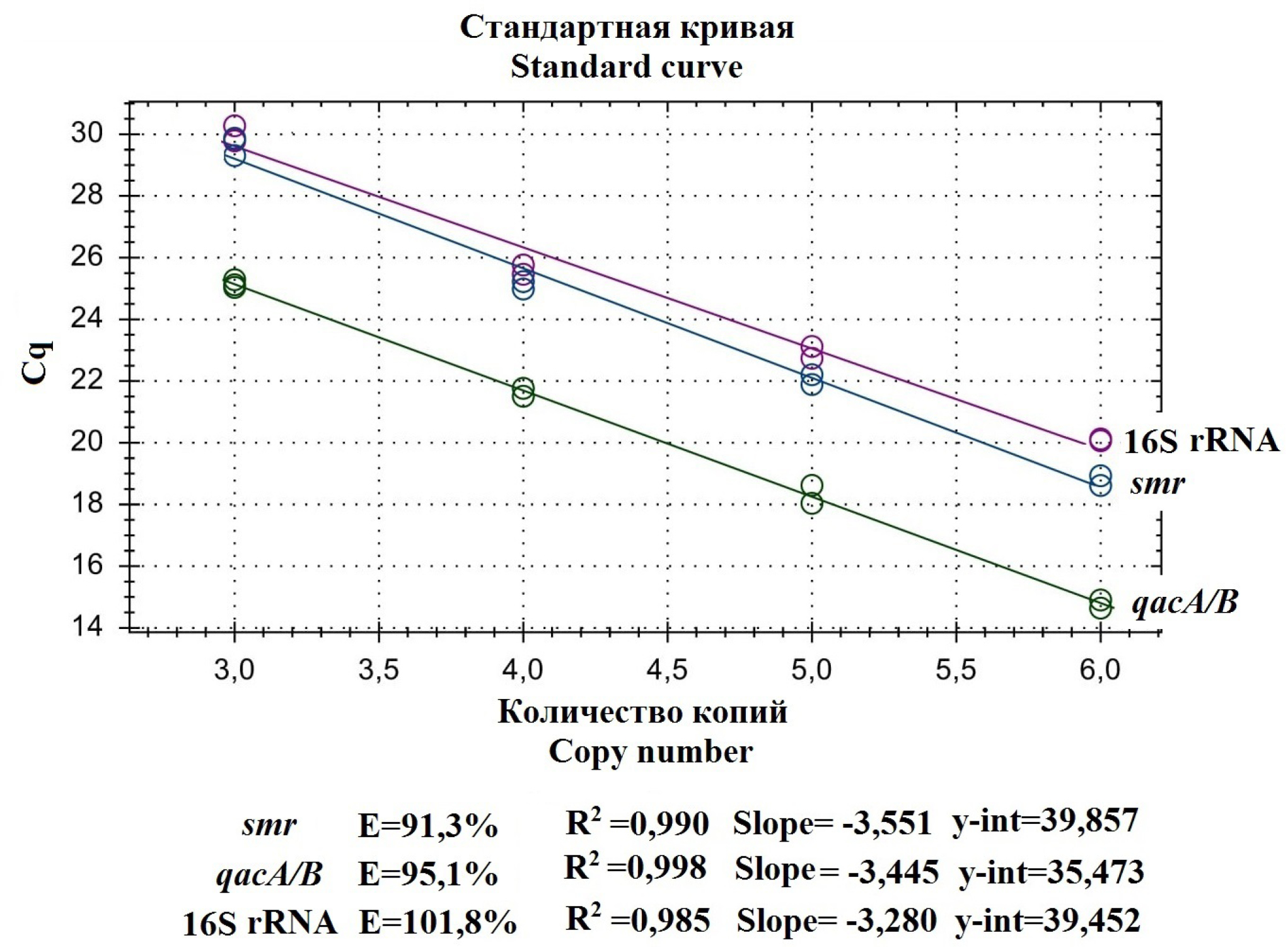 To evaluate the analytical sensitivity of multiplex real-time PCR, plasmids pTZ57-qacA/B, pTZ57-smr and pTZ57-16S containing the obtained amplicons of qacA/B, smr and 16S rRNA genes were constructed. Using tenfold dilutions, their samples with concentrations ranging from 101 to 106 copies in 1 μL were obtained and used as a template for the developed multiplex real-time PCR. The sensitivity of multiplex realtime PCR amounted to 103 copies for all genes. The amplification efficiency of qacA/B, smr, and 16S rRNA genes was 95.1, 91.3 and 101.8%, respectively (Fig. 2).
