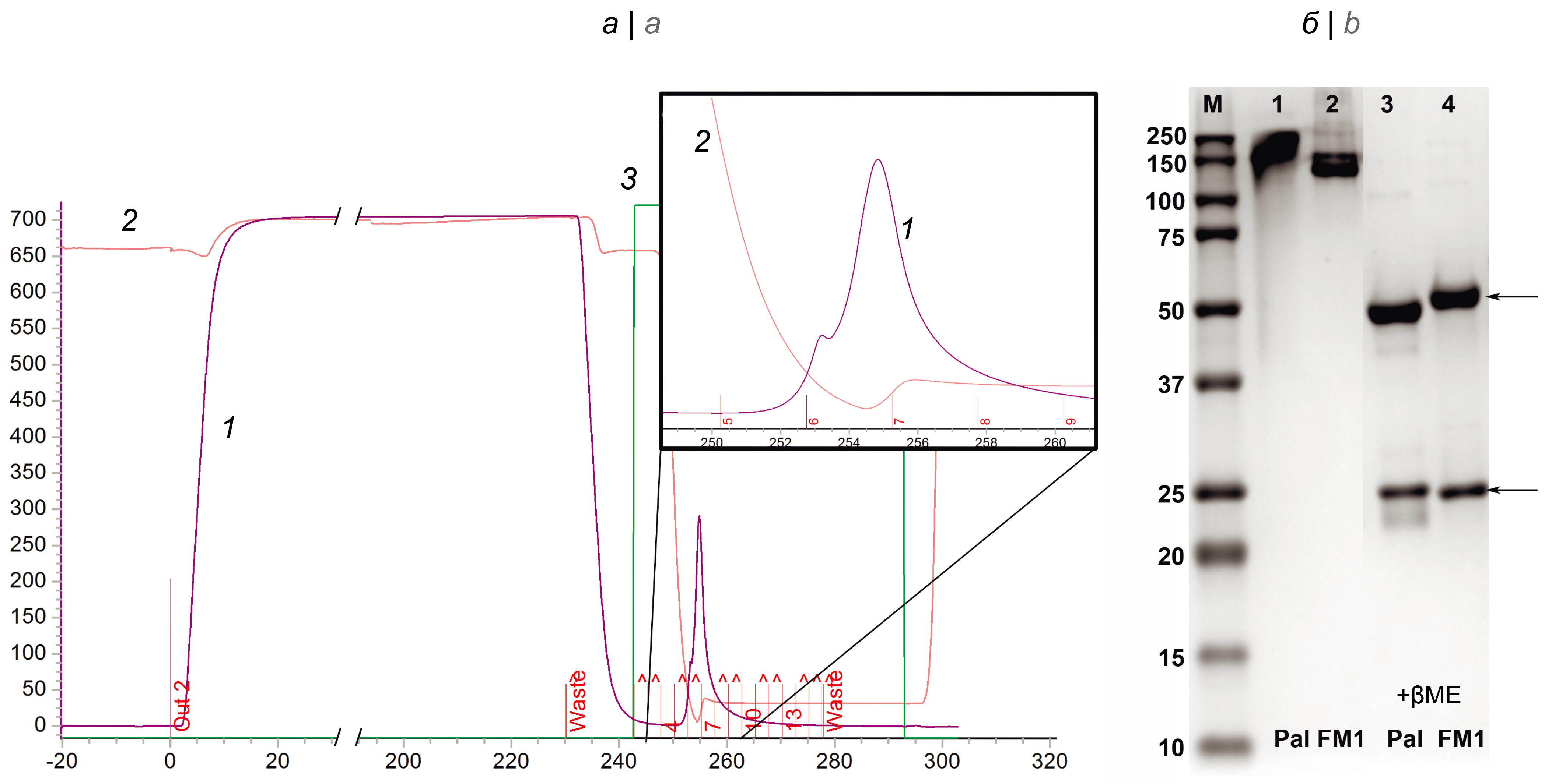 б — результаты электрофореза в ПААГ очищенного препарата FM1 в сравнении с контрольным препаратом паливизумабом (Pal). Препараты нанесены в невосстанавливающих (дорожки 1 и 2) и восстанавливающих условиях (дорожки 3 и 4; βME — β-меркаптоэтанол). М — маркер молекулярных масс «Precision Plus Protein Kaleidoscope» («Bio-Rad»). На дорожках 3 и 4 видны зоны, соответствующие электрофоретической подвижности тяжёлой (НС) и лёгкой (LC) цепей рМКА. Гель окрашен коллоидным раствором Кумасси и документирован при помощи системы «Gel Doc EZ Imager» («Bio-Rad»).