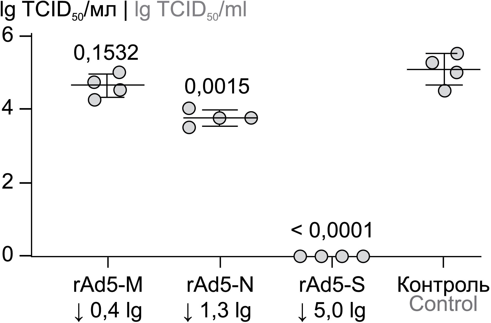 4. Fig. 3. Viral load in the lungs of hACE2-transgenic mice from the immunized and control groups (n = 4) on day 4 after infection with the SARS-CoV-2 virus. The figure shows individual data for each animal, the arithmetic mean and standard deviation, as well as the significance level p (Student's t-test).