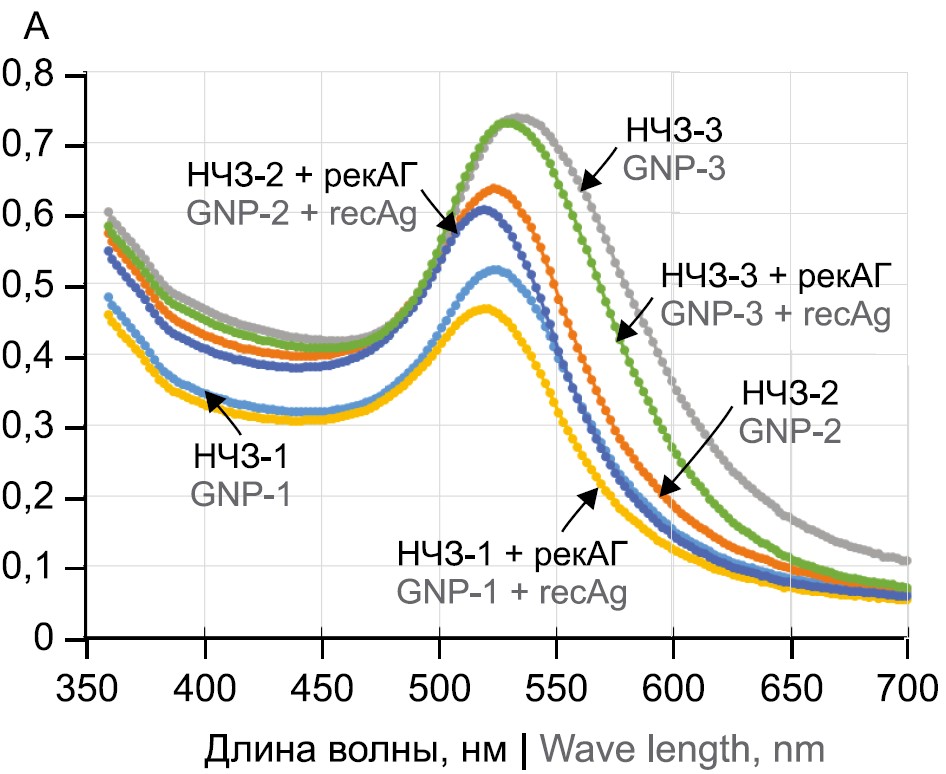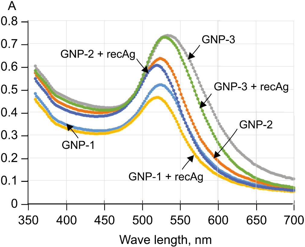 Most common method for production of GNP-based markers for use in immunochemical reactions is based on non-covalent (adsorption) conjugation of proteins on the surface of nanoparticles. This approach is technologically simple and preserves the native structure and properties of macromolecules in resulting complexes, in particular their immunoreactivity [27, 34, 35]. In this case, non-covalent bonds formed as a result of events such as electrostatic interactions between negatively charged nanoparticles and positively charged sites on protein surface, as well as hydrophobic attraction between protein and metal surface, donor-acceptor interactions between metal and electrons of nitrogen and sulfur atoms in protein composition [26]. It is also confirmed, that in the process of formation of GNP complexes with proteins a stabilizing protein shell is formed around them [35, 36]. In the present work, passive immobilization technique was also employed to obtain conjugates of three GNP samples with recAg.