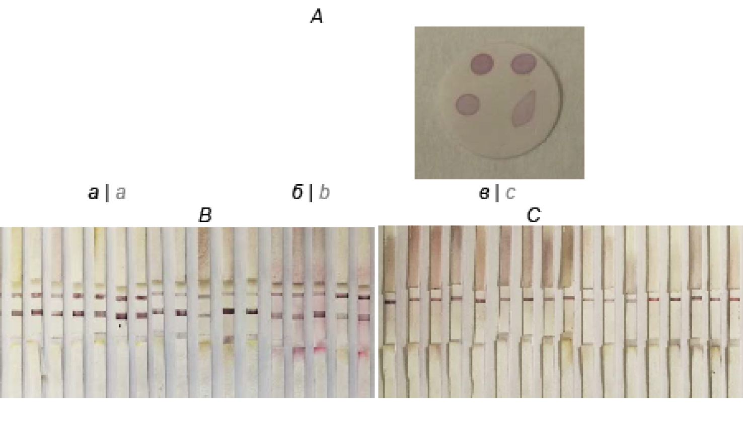 Рис. 5. Результаты дот-иммуноанализа (A) с применением конъюгатов НЧЗ с рекАг (а — НЧЗ-1; б — НЧЗ-2; в — НЧЗ-3) и ИХА положительных (В) и отрицательных (С) образцов сывороток с применением НЧЗ-3, конъюгированных с рекАГ.