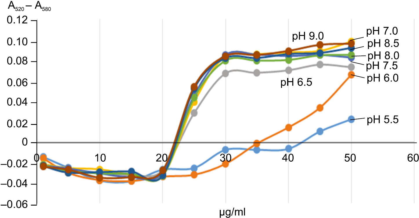 In order to obtain a stable sol, conditions of recAg adsorption on the surface of GNP were optimized taking into consideration physicochemical properties of the protein important for stabilization of colloidal system, such as molecular weight, solubility, isoelectric point (pI = 5.43) and its concentration. Stabilizing concentration of recAg was determined in pH range from 5.5 to 9.0 for all three sizes of GNP. Figure 4 demonstrates the dependence of indicator «A520 –A580» on protein concentration at different pH values for GNP-2.