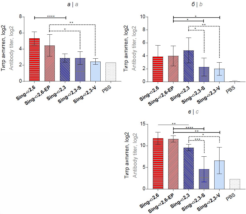 Двукратная иммунизация сирийских хомячков генно-инженерными вакцинными штаммами 17/Sing-α2,3 и 17/Sing-α2,6 приводила к формированию у животных схожих уровней сывороточных IgG-антител, связывающихся с антигеном Sing-α2,3, при этом вакцинный вирус 17/Sing-α2,3 индуцировал достоверно больше антител к антигену Sing-α2,6, чем к собственному антигену Sing-α2,3 (рис. 5). Полученные результаты полностью согласуются с результатами изучения антигенности пандемических вариантов А/Singapore/1/57 в эксперименте на мышах (рис. 3).