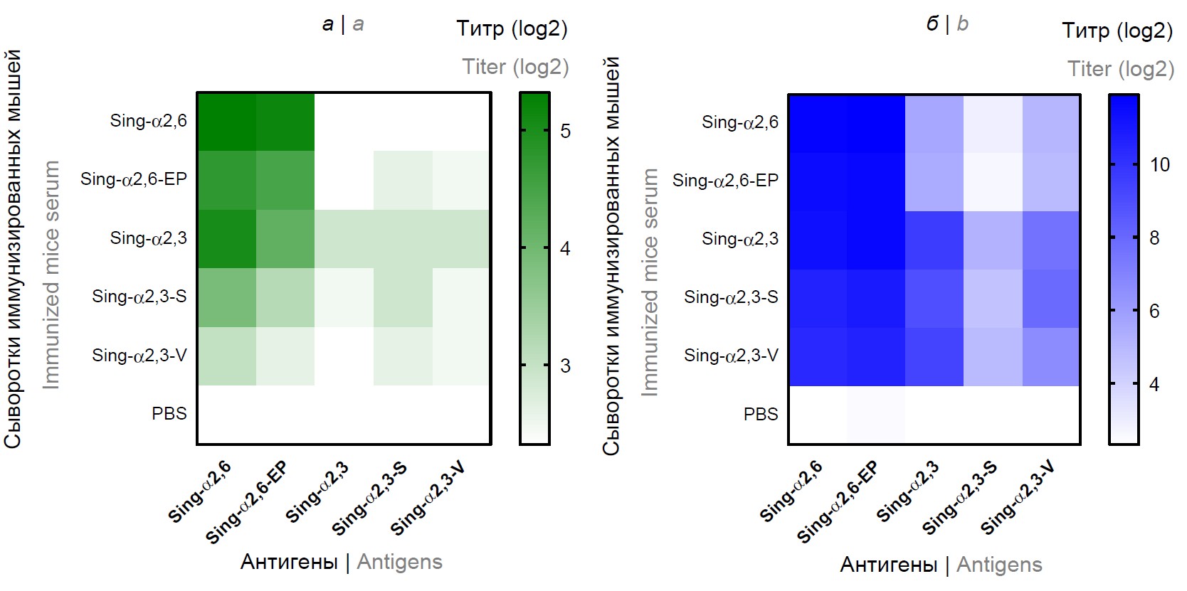 Далее была проведена оценка кросс-реактивности сывороточных антител, выработанных при введении 5 исследованных вариантов вируса А/Singapore/1/57 (H2N2), в отношении каждого варианта в РТГА и ИФА. Интересно, что при использовании в качестве антигенов в РТГА вирусов с α2-6-рецепторной специфичностью выявлялись существенно более высокие показатели титров антител во всех иммунизированных группах, по сравнению с антигенами, обладающими α2-3-специфичностью (рис. 3, а). При этом антитела в сыворотках группы Sing-α2,6 не уловили ни один из 3 вариантов вирусов с α2-3-рецепторной специфичностью. Несмотря на то что у мышей, иммунизированных MDCK-адаптированным вариантом Sing-α2,6-EP, выявлялись титры антител выше уровня детекции, статистически значимых отличий с группой контроля не обнаружено. Исследование кросс-реактивности сывороточных IgG-антител методом ИФА показало схожие результаты: вирусы с α2-6-рецепторной специфичностью в качестве антигенов выявляли наиболее высокие значения титров антител во всех группах, тогда как связывание антител с вирусами с α2,3-рецепторной специфичностью было значительно слабее у животных всех групп (рис. 3, б).