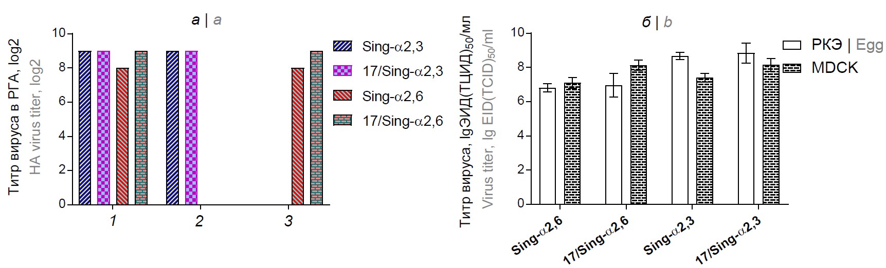 Для подтверждения этой гипотезы мы сконструировали методами обратной генетики 2 штамма живой гриппозной вакцины H2N2 на основе донора аттенуации А/Ленинград/134/17/57: А/17/Singapore/57/1 с генами HA и NA от вируса Sing-α2,3 (обозначен как 17/Sing-α2,3) и А/17/Singapore/57/2 с генами HA и NA от вируса Sing-α2,6 (17/Sing-α2,6). РГА с различными эритроцитами подтвердило рецепторную специфичность полученных вакцинных вирусов, которая совпадала с соответствующим диким вирусом (рис. 4, а), что ещё раз указывает на ключевую роль НА в связывании с гликановыми рецепторами клетки-хозяина. Важно отметить, что адаптация вакцинных штаммов к клеткам MDCK не привела к появлению новых мутаций в молекуле НА: более 50 накопленных из бляшек вирусов соответствовали исходному штамму ЖГВ. Оценка инфекционной активности сконструированных вирусов показала, что вакцинные штаммы 17/Sing-α2,3 и 17/Sing-α2,6 одинаково хорошо размножались в культуре клеток MDCK, тогда как в РКЭ вирус 17/Sing-α2,3 имел инфекционный титр на порядок выше, чем у вируса 17/Sing-α2,6 (рис. 4, б).