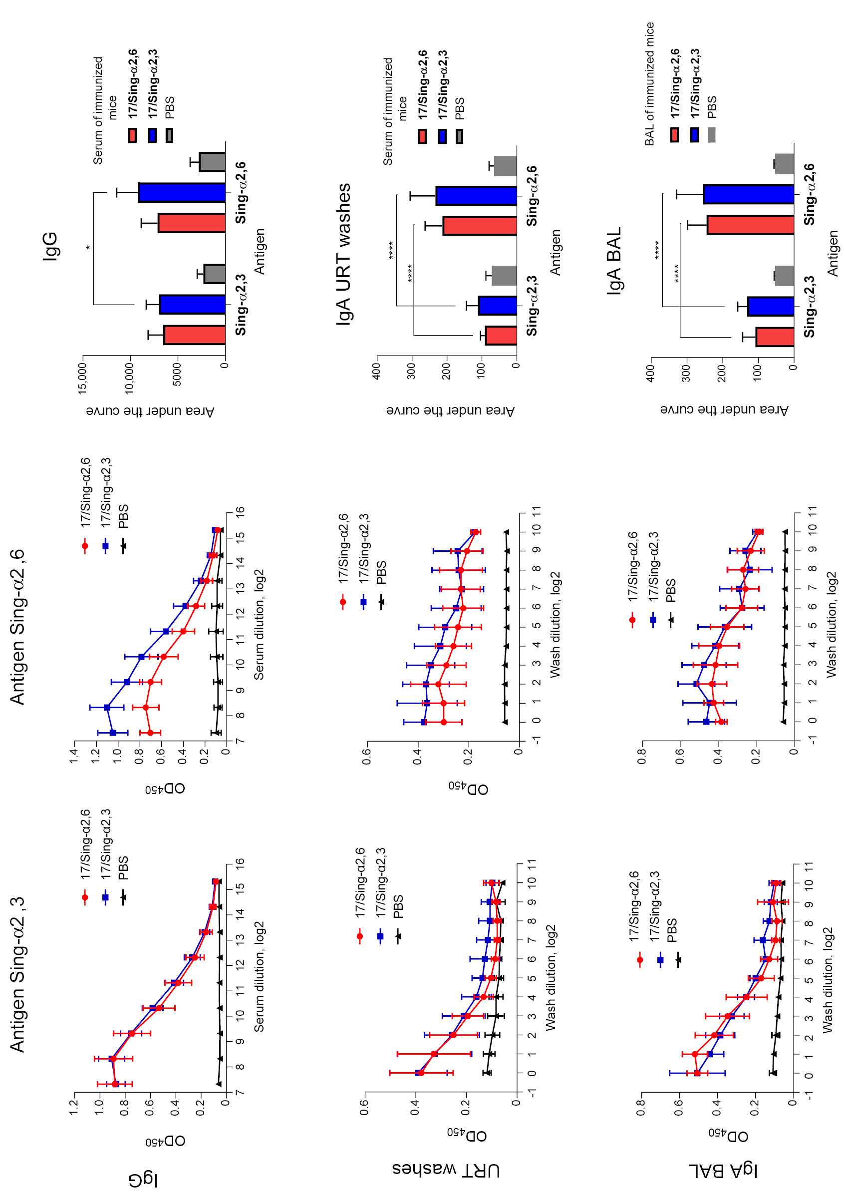 On the left are OD450 values at different dilutions of sera or washes from URT and bronchoalveolar lavage to Sing-α2,3 virus in ELISA. In the middle are OD450 values at different dilutions of sera or washes to Sing-α2,6 virus in ELISA. On the right are the area under the optical density curve at 450 nm in ELISA with the corresponding antigen.