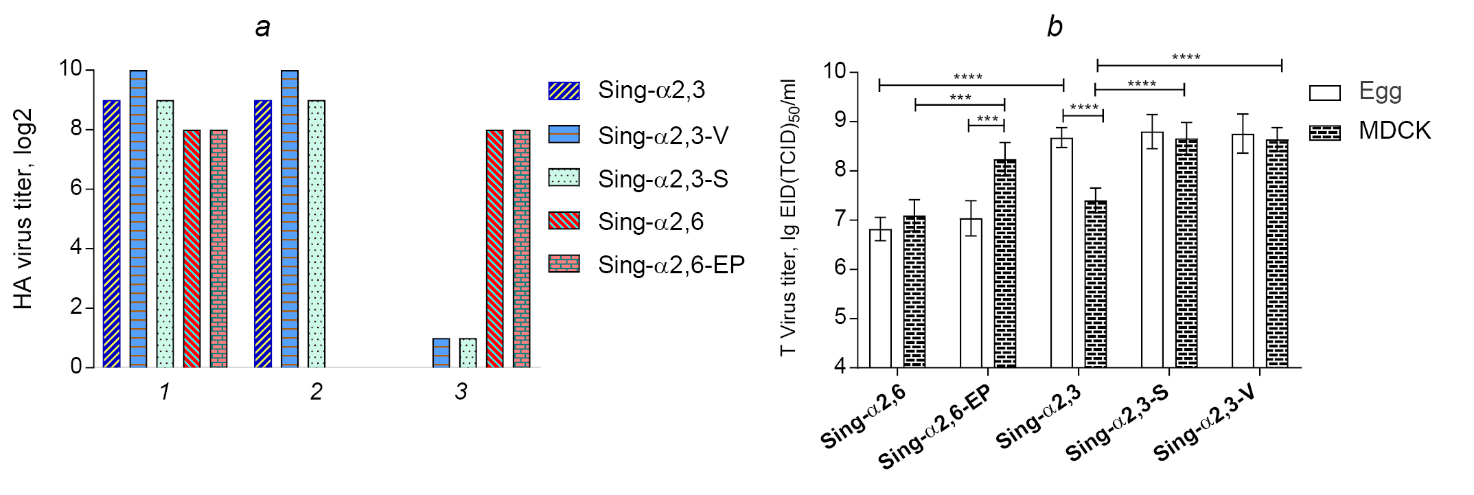 To confirm this hypothesis, we constructed two LAIV strains H2N2 subtype based on the attenuation donor A/Leningrad/134/17/57: A/17/Singapore/57/1 with HA and NA genes from Sing-α2,3 virus (designated as 17/Sing-α2,3) and A/17/Singapore/57/2 with HA and NA genes from Sing-α2,6 virus (17/Sing-α2,6) by reverse genetics methods. HA assay with different RBC confirmed the receptor specificity of the resulting vaccine viruses, which matched that of the corresponding wild-type virus (Fig. 4, a), further indicating the key role of hemagglutinin in binding to host cell glycan receptors. Importantly, adaptation of the vaccine strains to MDCK cells did not result in new mutations in the HA molecule: more than 50 viruses isolated from the plaques matched to the original strain of LAIV. Evaluation of the infectious activity of the engineered viruses showed that the vaccine strains 17/Sing-α2,3 and 17/Sing-α2,6 multiplied equally well in MDCK cells, whereas in eggs, the 17/Sing-α2,3 virus had an infectious titer an order higher than that of the 17/Sing-α2,6 virus (Fig. 4, b).