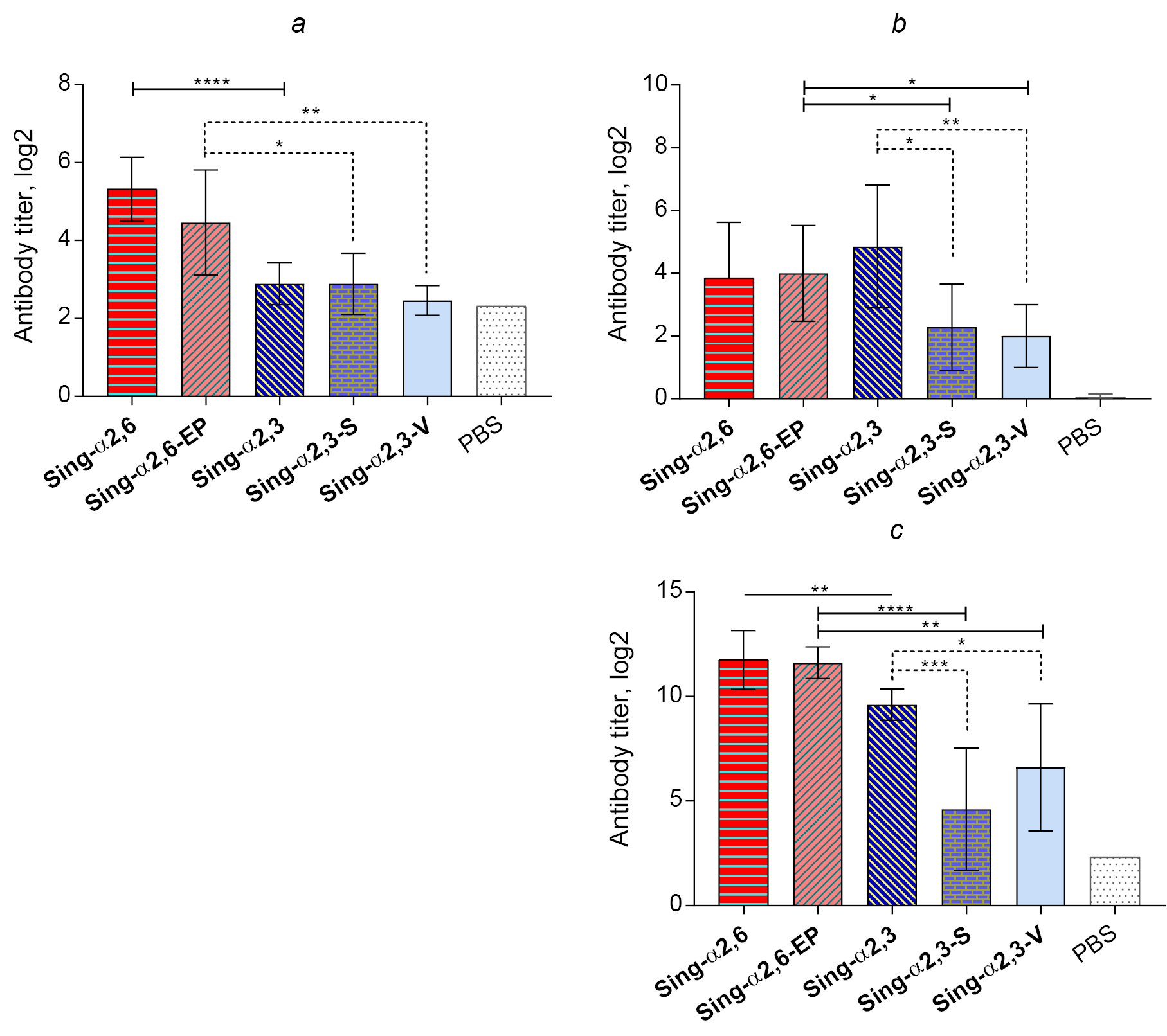 Immunization of CBA mice with the original Sing-α2.6 and Sing-α2,3 strains and MDCK-adapted variants induced higher levels of homologous serum antibodies to Sing-α2.6 and Sing-α2.6-EP viruses compared with viruses with affinity for α2.3 receptors (Fig. 2, a, b). At the same time, cell-adapted Sing-α2,3-S and Sing-α2,3-V variants induced significantly lower levels of homologous serum IgG antibodies compared with the original Sing-α2,3 variant (Fig. 2, b). Examination of the local humoral immune response showed significant increases in secretory IgA antibodies in all 5 viruses tested: Sing-α2,6, Sing-α2,6-EP, Sing-α2,3, Sing-α2,3-S and Sing-α2,3-V (Fig. 2, c). Comparison of IgA antibody levels in the original Sing-α2,6 and Sing-α2,3 virus groups showed no differences (p = 0.3355), which is in contrast to the data on the systemic humoral response. Nevertheless, a comparative analysis of the levels of secretory IgA antibodies between groups of animals infected with MDCK-adapted variants of Sing-α2,6-EP, Sing-α2,3-S, and Sing-α2,3-V, as well as in the systemic response, revealed the superiority of Sing-α2,6-EP virus. Summarizing the data on the induction of systemic and local immune response by the studied viruses, we can conclude that all the viruses induce humoral response, but the MDCK-adapted variants with α2,3 receptor specificity (Sing-α2,3-S and Sing-α2,3-V) were the least immunogenic at the level of both systemic and local humoral immunity. On the contrary, Sing-α2,6, Sing-α2,6-EP viruses with α2,6 receptor specificity did not differ in immunogenicity in any of the tests.