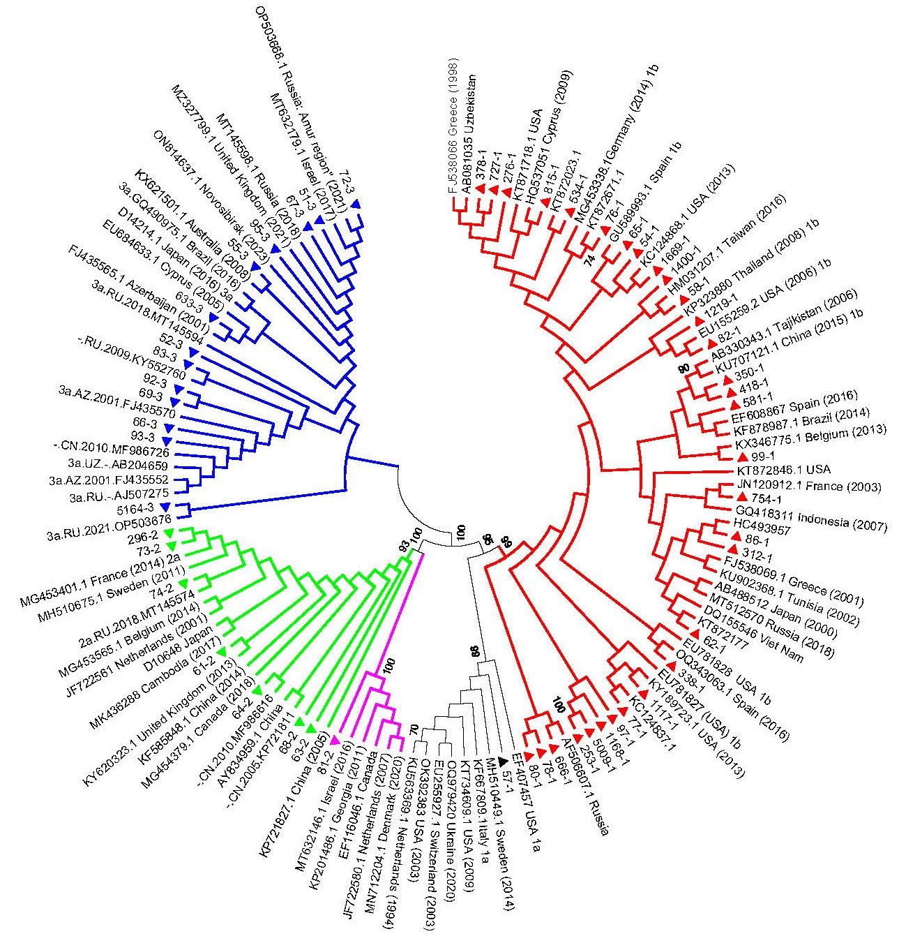 Sample No. 57, for which no result was obtained during preliminary genotyping using AmpliSens -1/2/3 diagnostic test system, formed a single cluster with isolates belonging to subtype 1a and isolated in different years in the USA (KT734609. 1, OK392383), where this genetic variant is endemic, as well as in Sweden (MH510449.1), Ukraine (OQ979420), Switzerland (EU255927.1), and the Netherlands (KU563369.1), but no closely related strains were identified for it.
