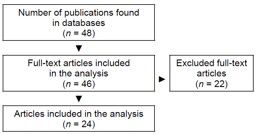 Literature sources were searched using the PubMed database using the query “resistotypes[text] OR resistotype[text]” (query date 06.08.2024). Full-text articles published between 2014 and 2024 were reviewed. Relevant articles were also searched in the Google Scholar database using the query “resistotype” for the same period. Articles describing individual resistotypes of bacteria or microbial communities were included in the study. Papers for which it was not possible to obtain the full text of the article, as well as articles written in languages other than English, were excluded from the search results (no Russian-language publications on this topic were found, including in the eLIBRARY database). Forty-three articles were found in the PubMed database for the above-mentioned query. Also, 5 articles were additionally included in the review based on the search results in the Google Scholar database (Fig. 1). Two publications in Turkish and 22 articles lacking descriptions of individual resistotypes were excluded from the analysis.
