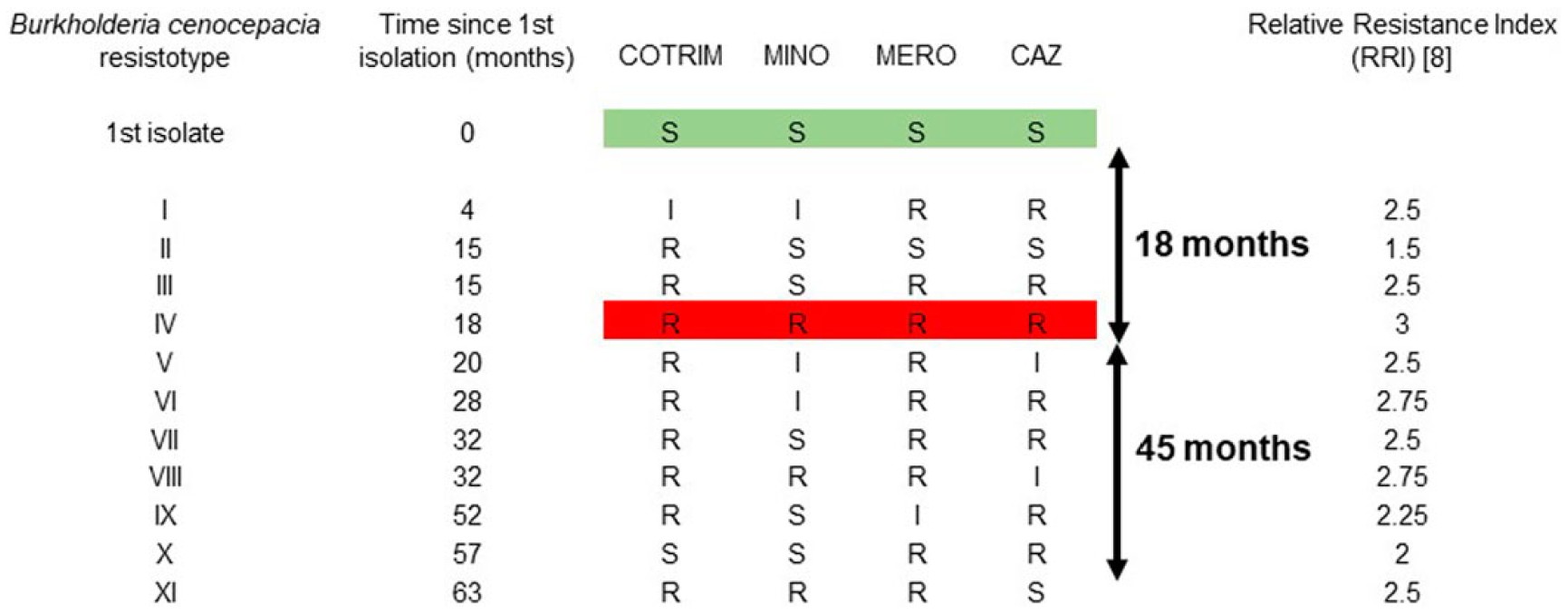 Fig. 2. Description of 11 resistotypes of B. cenocepacia isolates from adult cystic fibrosis patient samples over a period of 63 months.
