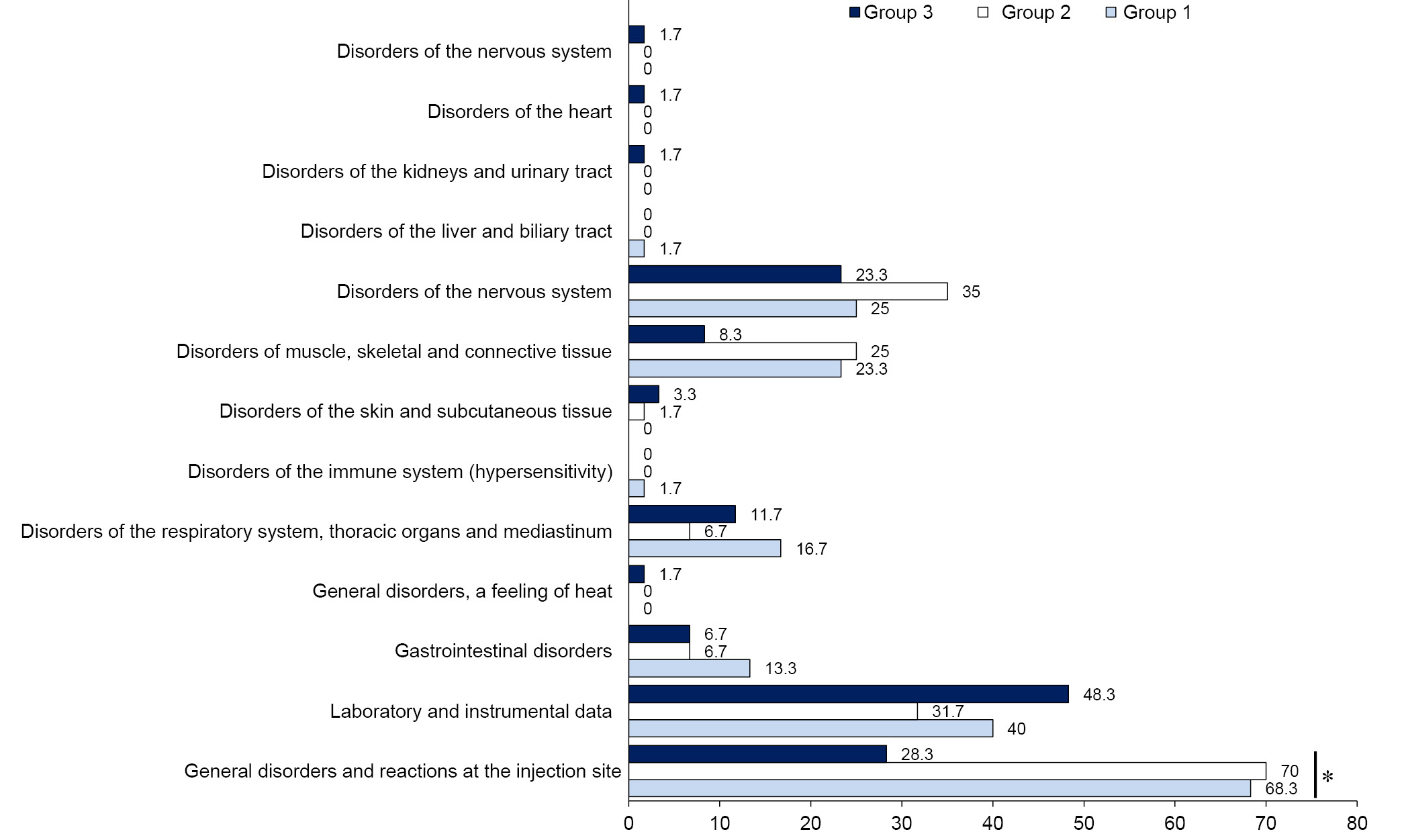 Fig. 1. Proportion of volunteers with AEs by organ system class. * — statistically significant differences.