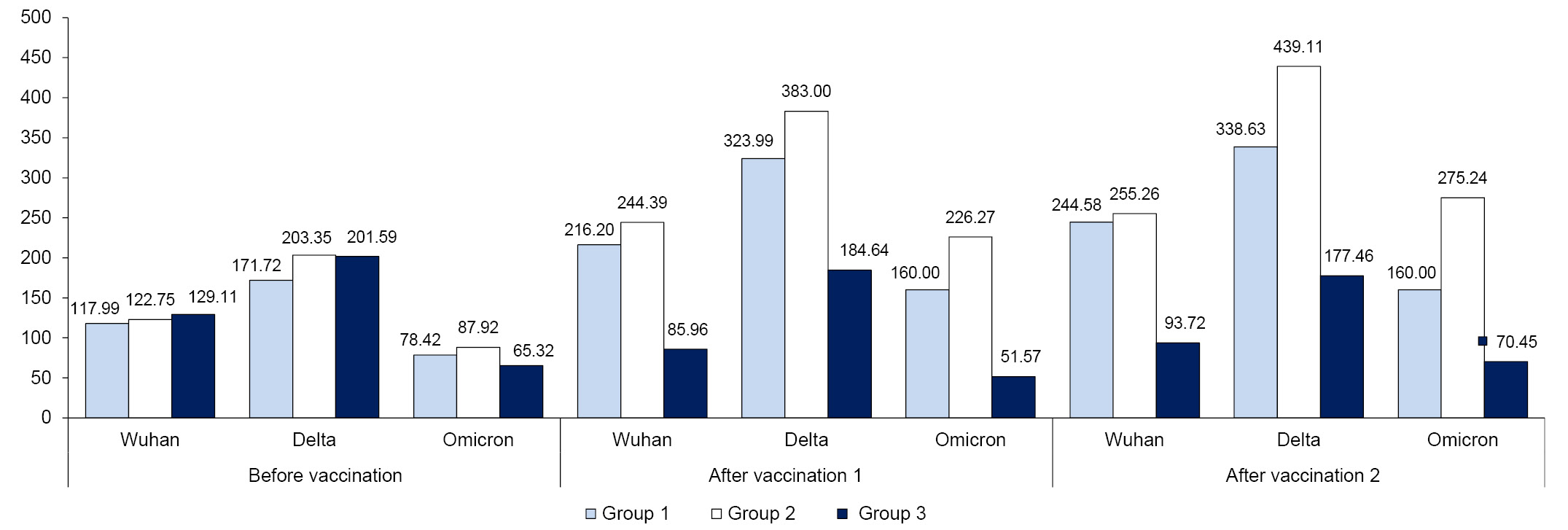 At the screening in the research centers, all volunteers were negative in the rapid test for COVID-19, but antibodies were observed in ELISA and neutralization reactions. In the placebo group, GMT values fluctuated insignificantly, and an increase in GMT was observed in groups 1 and 2 against Wuhan, Delta and Omicron strains (Fig. 2).