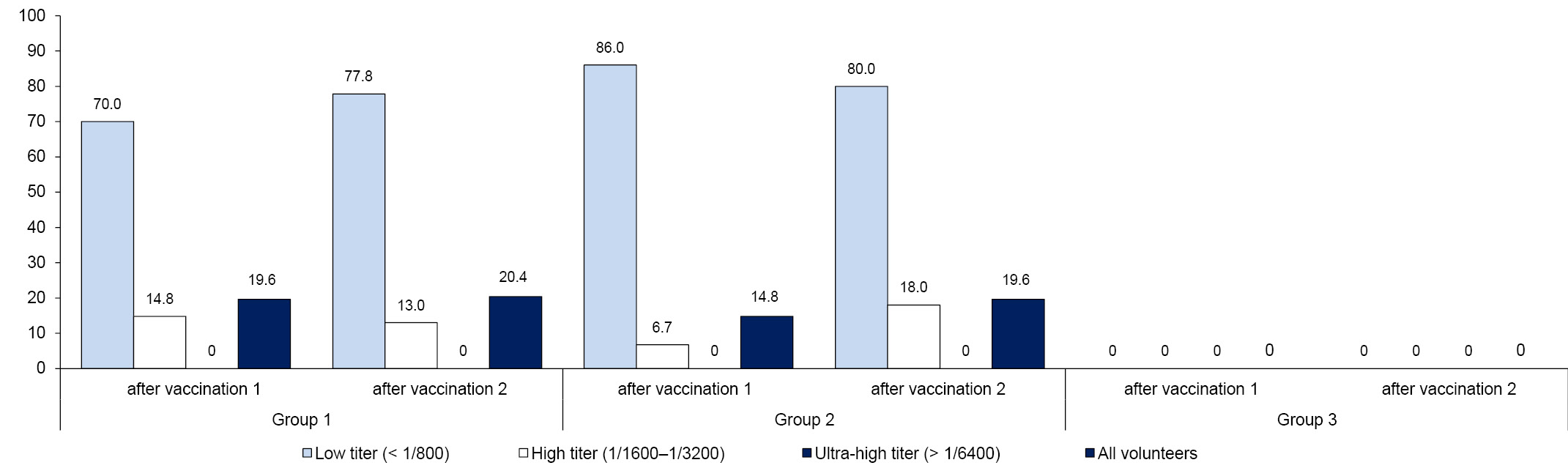 - Group 2 — 60 volunteers who were vaccinated with 80 µg antigen vaccine twice at an interval of 21 days intramuscularly;