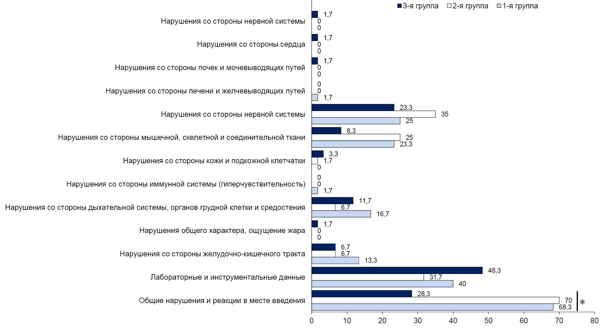Fig. 1. Proportion of volunteers with AEs by organ system class. * — statistically significant differences.