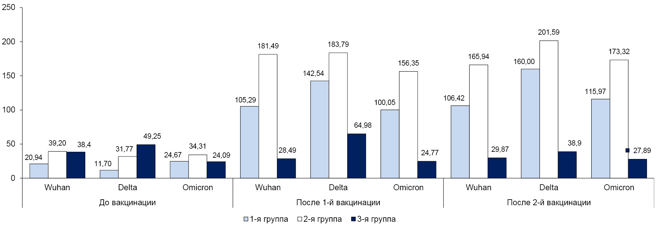 The levels of neutralizing antibodies were determined by titrating sera from 1 : 10 to 1 : 1280 against 100 TCID50 of three SARS-CoV-2 strains from the Molecular Diagnostics Laboratory collection: Wuhan, Delta (line B.1.617.2) and Omicron (variant XBB 1.5). Neutralization reactions were performed by micromethod in 96-well plates on Vero E6 green monkey kidney cell culture. Serum dilutions were incubated with viruses for 1 h at 37°C in an atmosphere of 5% CO2 and transferred to a plate with a cell monolayer. After 72 h, the reaction was counted by the presence of cytopathic action of the virus. The serum titer (the last neutralizing dilution) was considered to be the dilution at which 100% cell protection (no cytopathic effect) was ensured.
