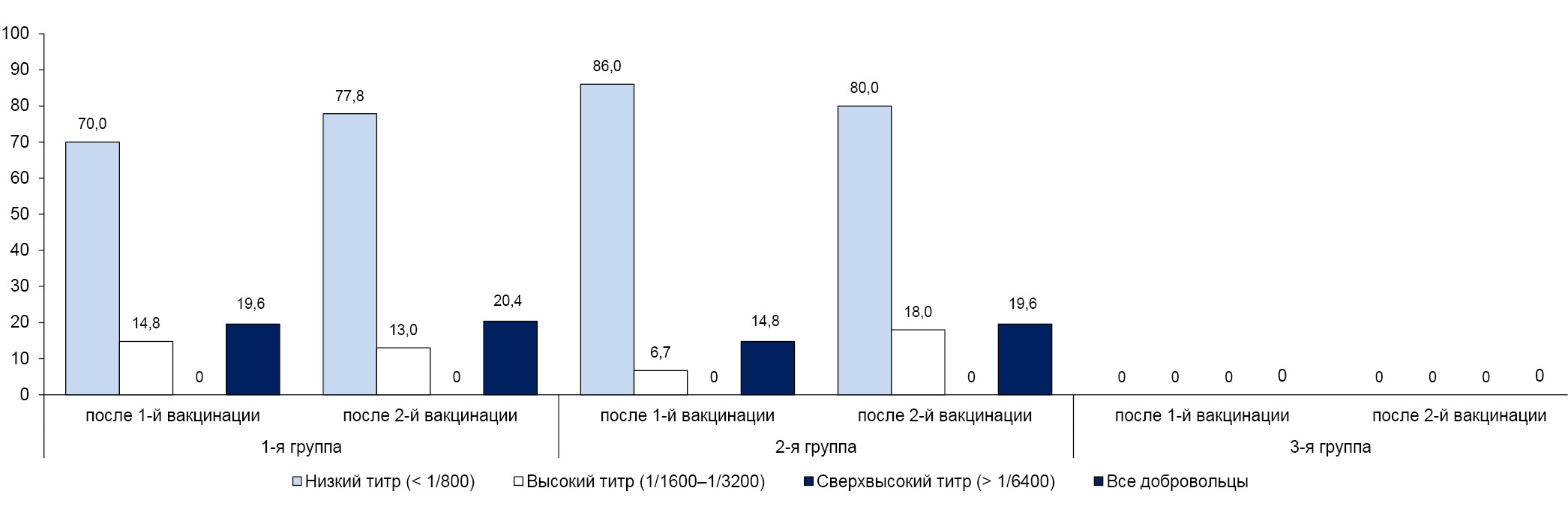 - Group 2 — 60 volunteers who were vaccinated with 80 µg antigen vaccine twice at an interval of 21 days intramuscularly;