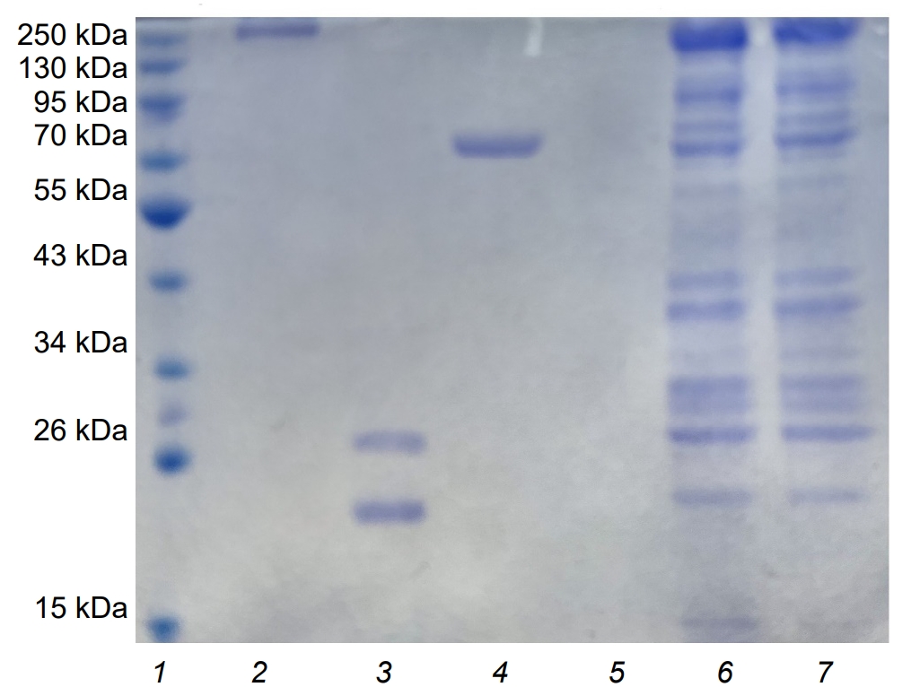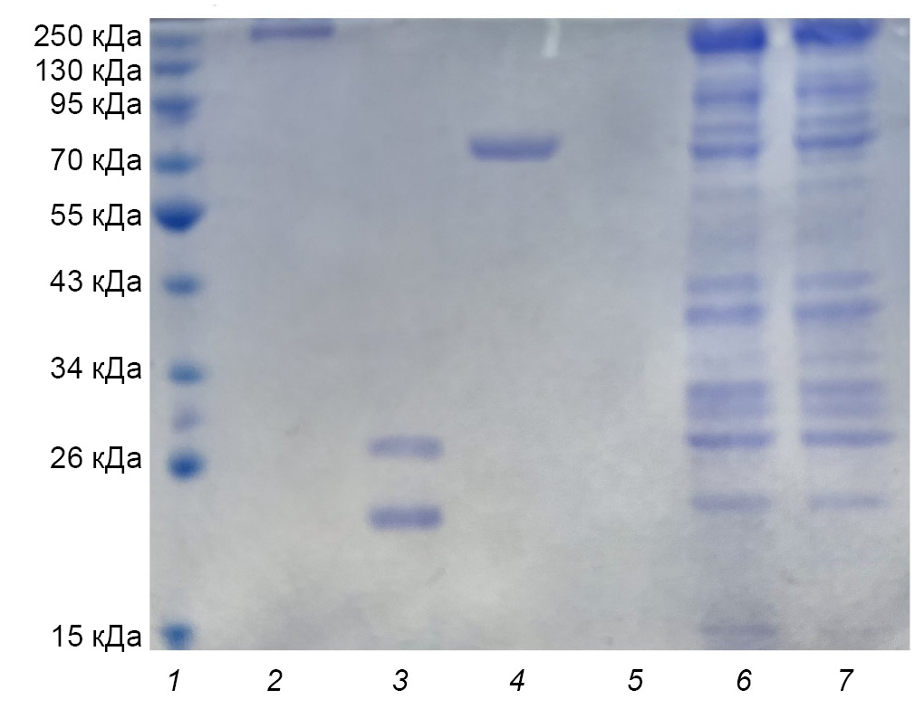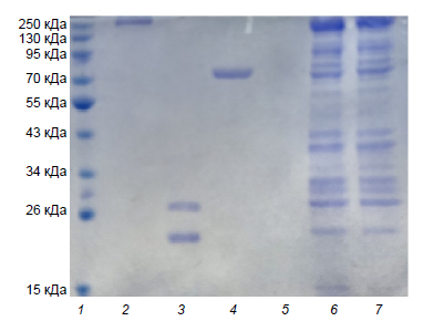 1 — маркеры молекулярной массы; 2 — ФГА; 3 — КТ; 4 — ПРН; 5 — ЛПС; 6 — АК штамма № 317 (биоплёночная культура); 7 — АК штамма № 317 (планктонная культура).