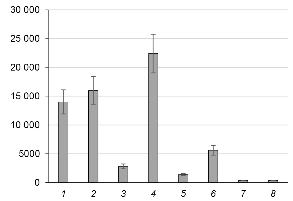 По оси ординат: титры антител. 1 — КТ БКВ-П; 2 — КТ БКВ-Б; 3 — ФГА БКВ-П; 4 — ФГА БКВ-Б; 5 — ПРН БКВ-П; 6 — ПРН БКВ-Б; 7 — ЛПС БКВ-П; 8 — ЛПС БКВ-Б. Титры IgG-антител у интактных мышей ≤ 100.