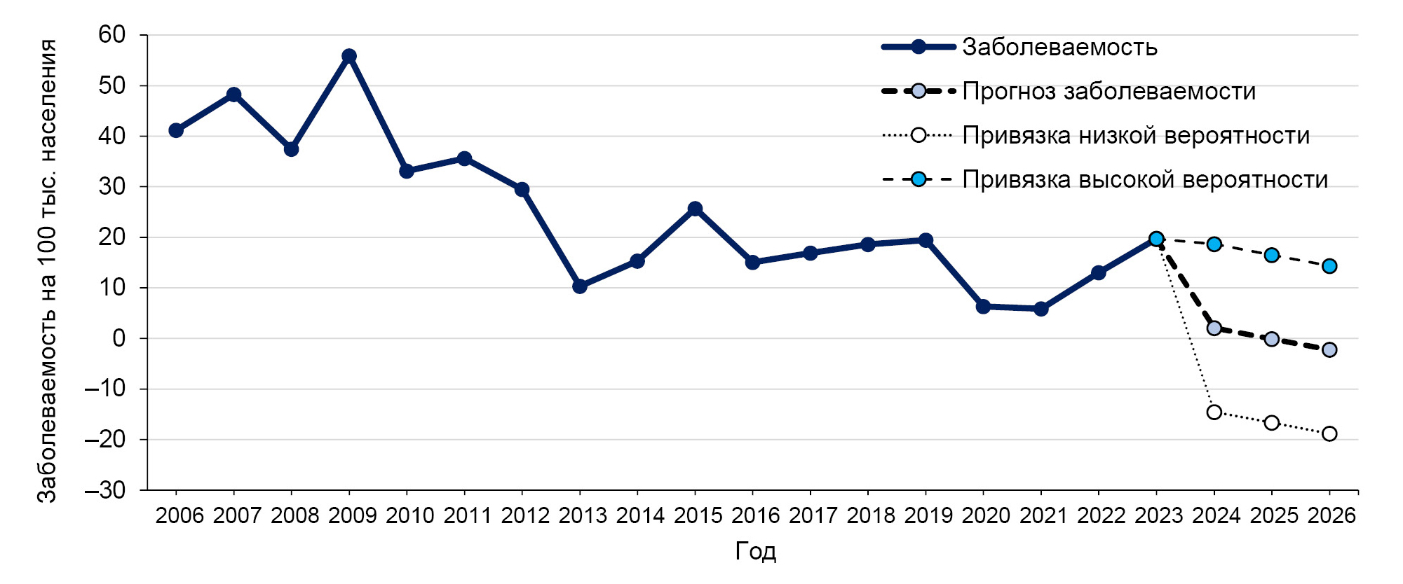 The interval forecast of Lyme disease incidence in the Kirov region for the 2024–2026 period demonstrates a downward trend. The observed decrease in the intensity of manifestations of the epidemic process can be explained by an increase in the volume of acaricide treatments, changes in weather conditions (a tendency to decrease the average annual precipitation). It should be noted that the influence of other factors cannot be excluded.