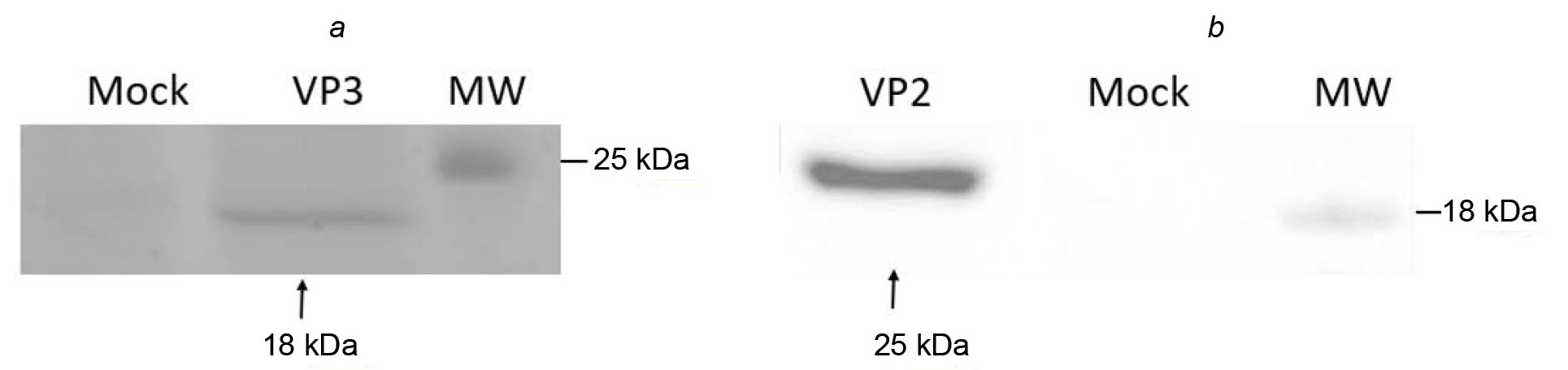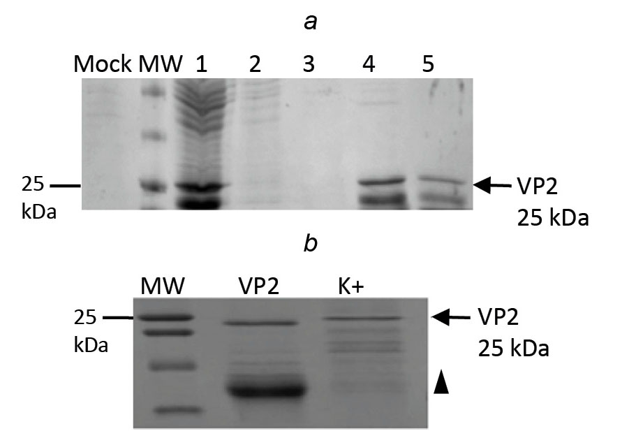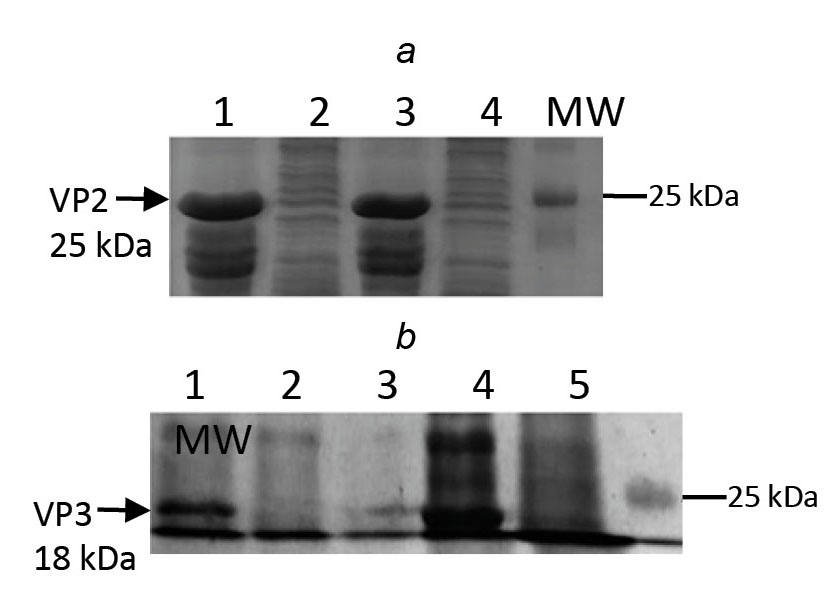 a — expression of recombinant VP3 protein; b — cell lysate after expression of recombinant VP2 protein (1), isolated and desalted recombinant VP2 protein (2), Mock (3). HRP-labeled antibodies against mouse IgG (Abcam) were used for detection.
