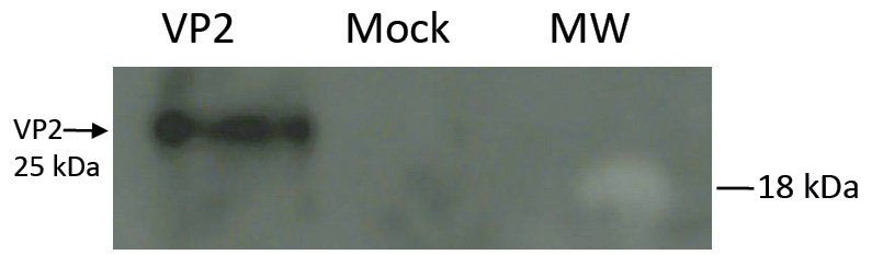 To prove the specificity of recombinant VP2 protein in Western blot, mouse sera to TBEV were also used (Fig. 10). Recombinant TBEV sE protein served as a positive control [22]. The VP2 protein we obtained did not bind to TBEV antibodies.