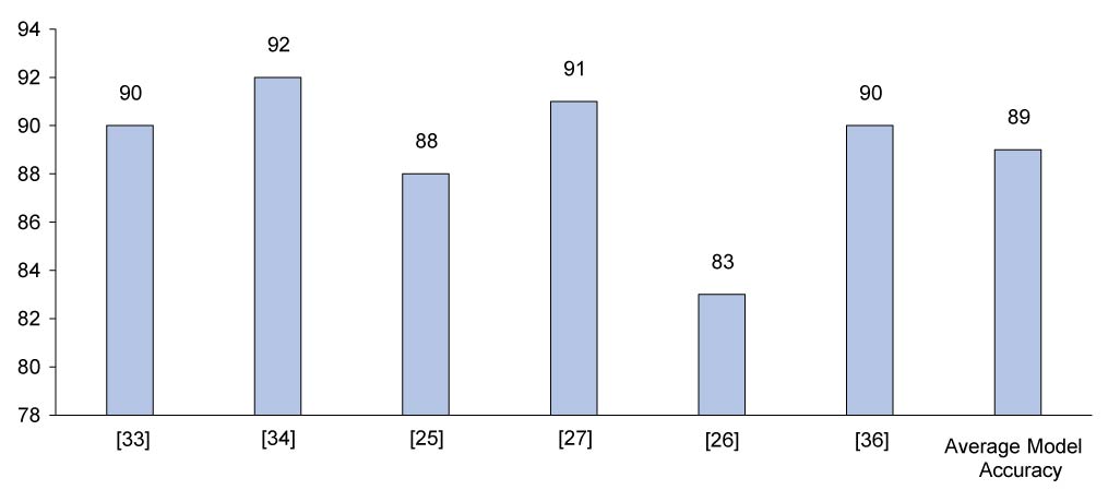 The Figure 5 illustrates the accuracy of various random forest models applied in dengue forecasting studies. The dataset includes models developed by six original research, with accuracy values ranging from 83% to 92%. The average model accuracy is recorded at 89%. The results highlight the superior predictive performance of random forest models in dengue incidence forecasting, reinforcing their potential for integration into early warning systems for outbreak management.